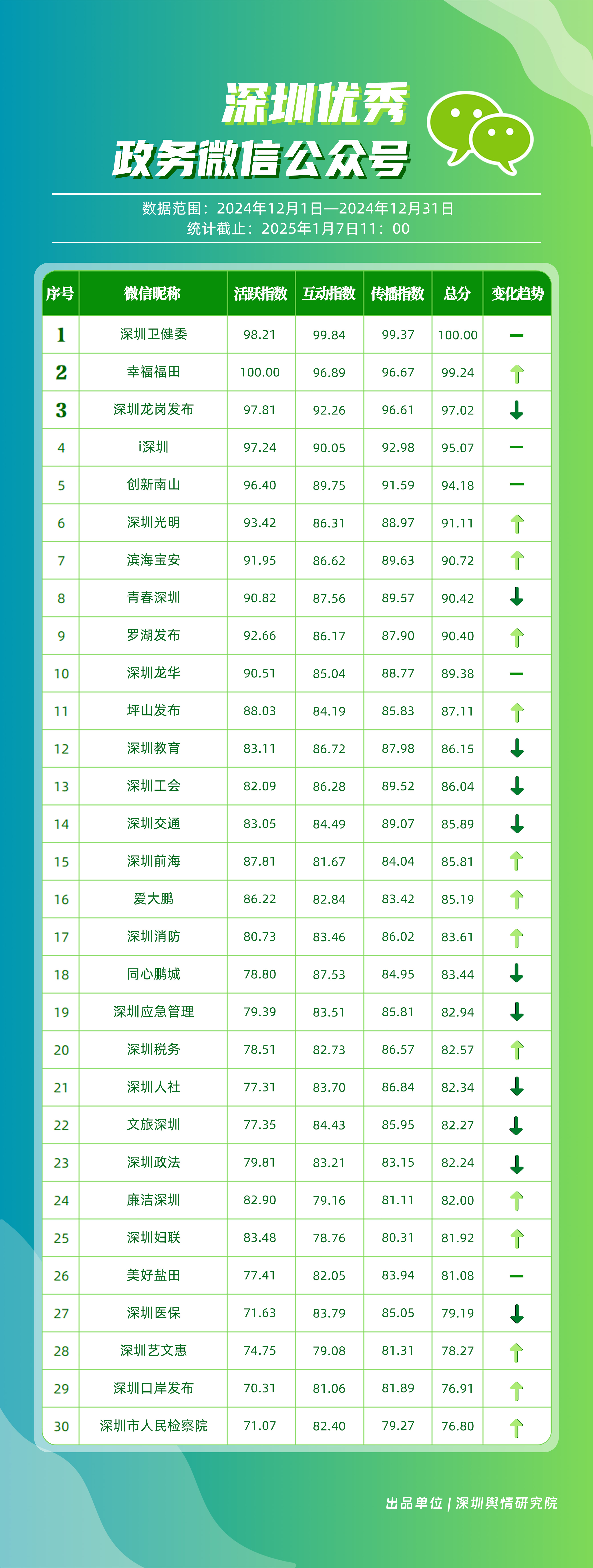 12月,“深圳衛(wèi)健委”“幸福福田”“深圳龍崗發(fā)布”“i深圳”“創(chuàng)新南山”“深圳光明”“濱海寶安”“青春深圳”“羅湖發(fā)布”“深圳龍華”等30個(gè)賬號入選“深圳優(yōu)秀政務(wù)微信公眾號”。其中,“深圳衛(wèi)健委”位于榜單首位,總分為100分?!靶腋8L铩薄吧钲诠饷鳌薄盀I海寶安”“羅湖發(fā)布”排名在本期有所提升,展現(xiàn)了他們不斷提升的傳播力、影響力。“i深圳”“創(chuàng)新南山”則保持了穩(wěn)定的排名,持續(xù)在政務(wù)信息宣傳中發(fā)揮著重要作用。