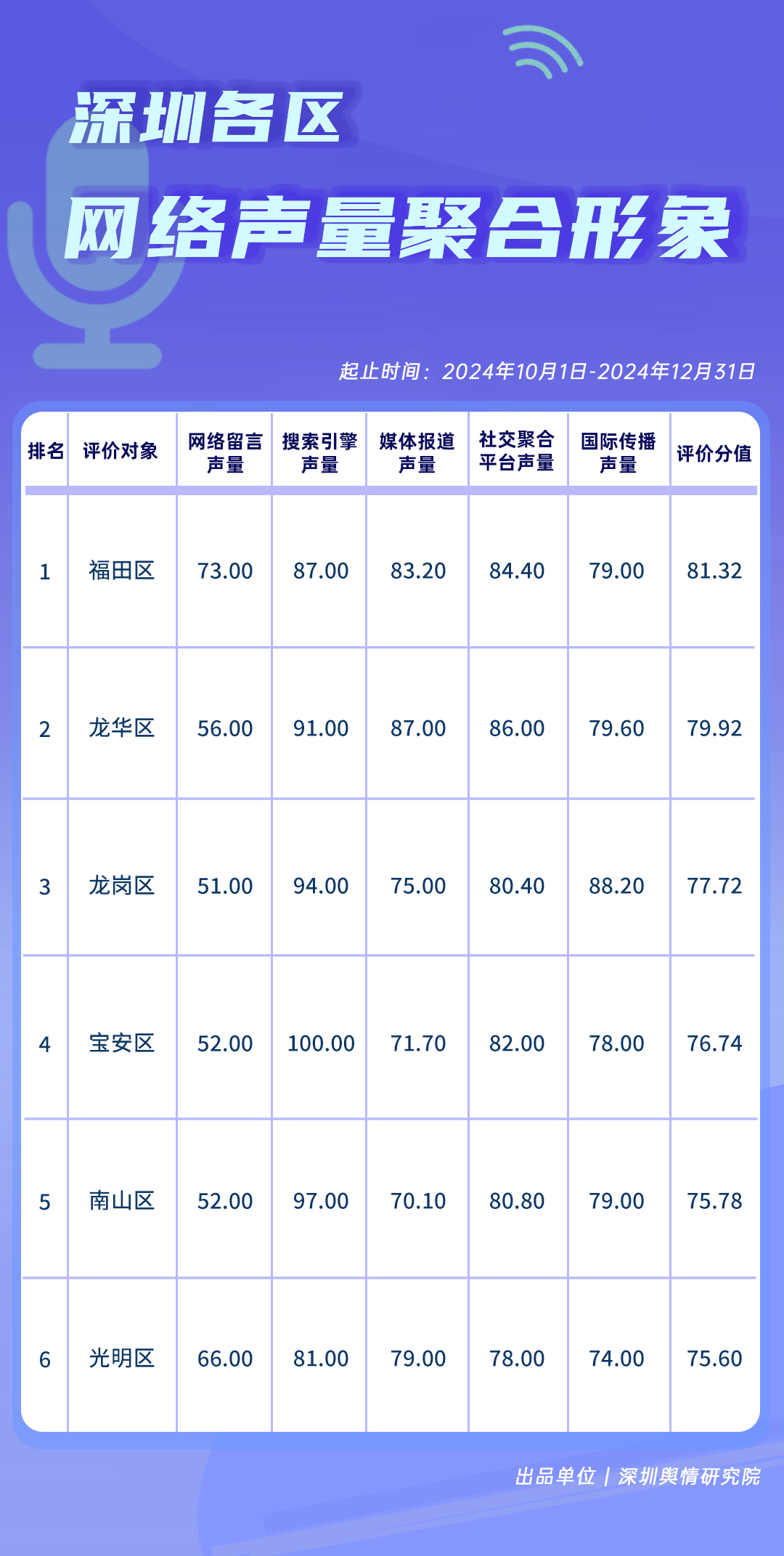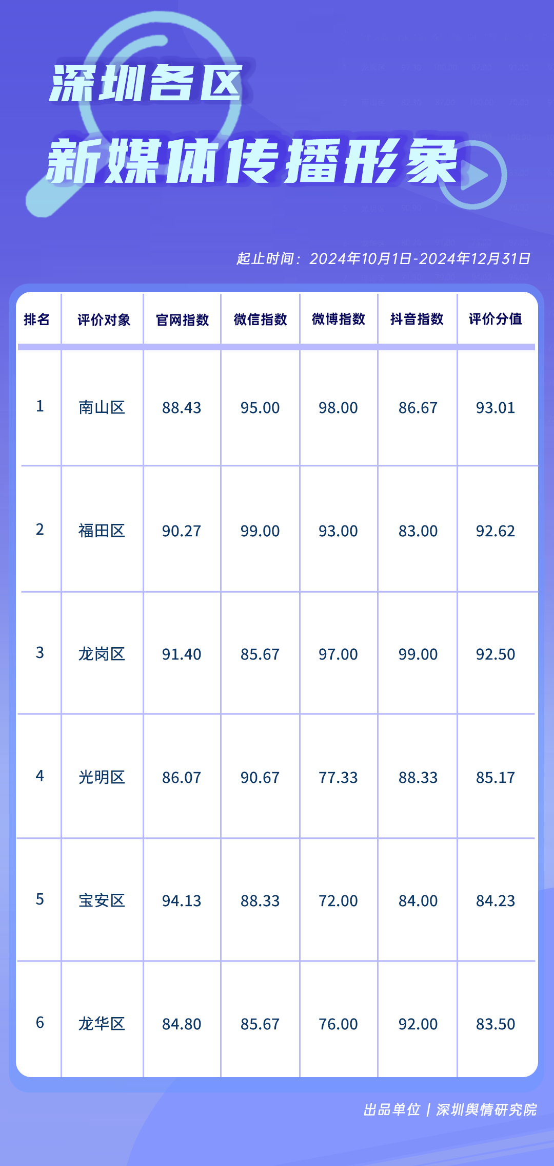 10-12月,福田區(qū)、龍崗區(qū)、光明區(qū)、龍華區(qū)、南山區(qū)、寶安區(qū)登上榜單前六。榜單中,福田區(qū)、龍崗區(qū)、光明區(qū)位列前三,綜合評(píng)價(jià)分值均在80分以上,居于榜單第四至第六名的龍華區(qū)、南山區(qū)、寶安區(qū)也在積極塑造網(wǎng)絡(luò)形象的道路上不斷邁進(jìn),展現(xiàn)了各區(qū)在網(wǎng)絡(luò)形象建設(shè)領(lǐng)域的蓬勃活力與持續(xù)努力。