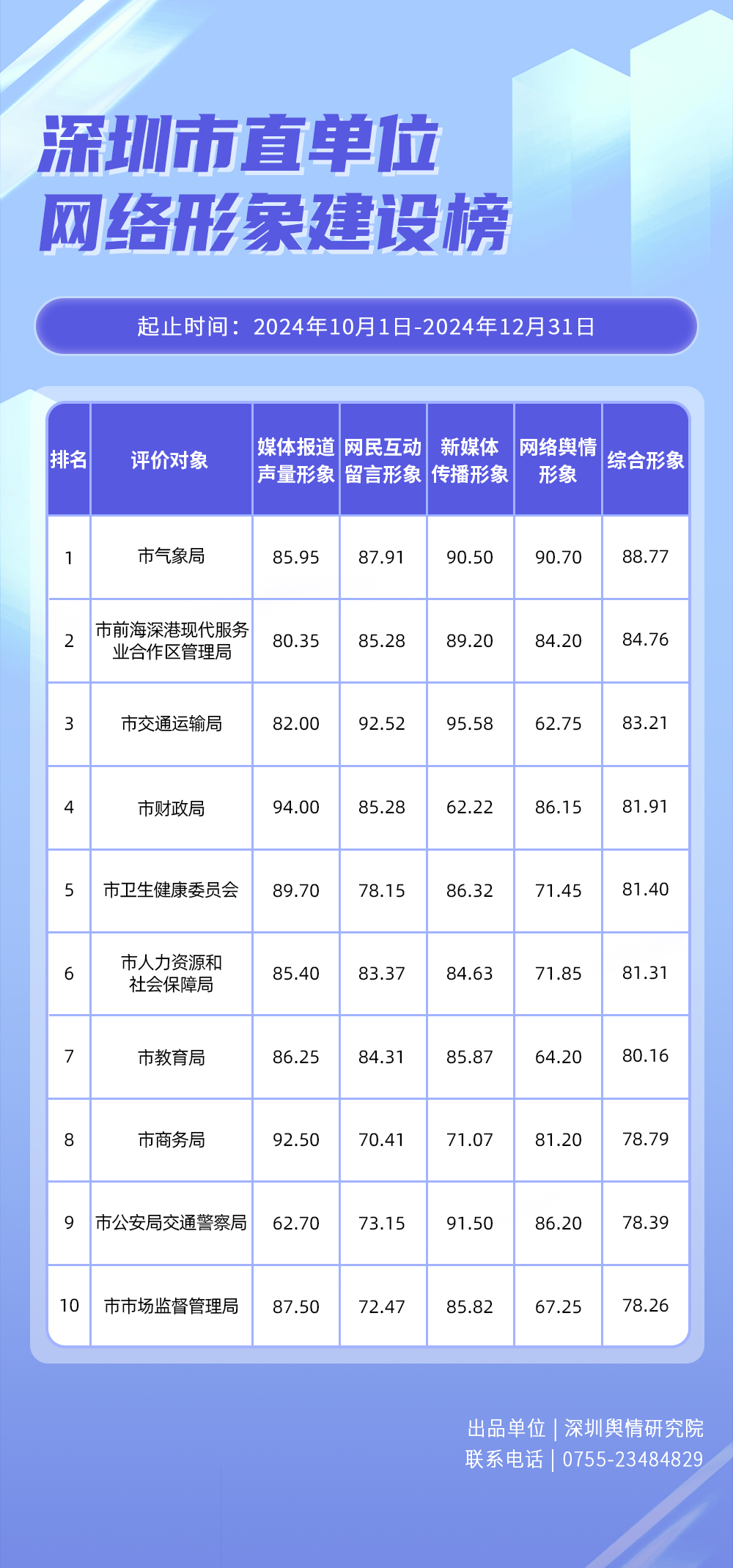 10-12月,市氣象局、市前海深港現(xiàn)代服務(wù)業(yè)合作區(qū)管理局、市交通運(yùn)輸局、市財(cái)政局、市衛(wèi)生健康委員會(huì)、市人力資源和社會(huì)保障局、市教育局、市商務(wù)局、市公安局交通警察局、市市場(chǎng)監(jiān)督管理局在網(wǎng)絡(luò)形象建設(shè)工作方面表現(xiàn)相對(duì)突出,登上《深圳市直單位網(wǎng)絡(luò)形象建設(shè)榜》。其中,市氣象局、市前海深港現(xiàn)代服務(wù)業(yè)合作區(qū)管理局、市交通運(yùn)輸局憑借其卓越的網(wǎng)絡(luò)形象建設(shè)工作,成功躋身前列,體現(xiàn)出高水平的網(wǎng)絡(luò)形象管理能力,展現(xiàn)了市直單位在新媒體時(shí)代下的責(zé)任與擔(dān)當(dāng),為構(gòu)建和諧社會(huì)環(huán)境貢獻(xiàn)了積極力量。