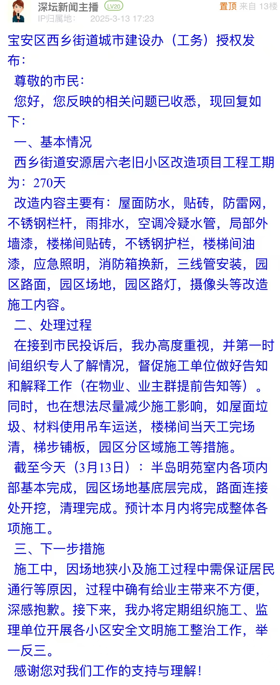 有市民反映寶安區(qū)一小區(qū)舊改過程中,施工單位無人監(jiān)管、施工無計劃、物業(yè)單位不作為、未做到文明施工