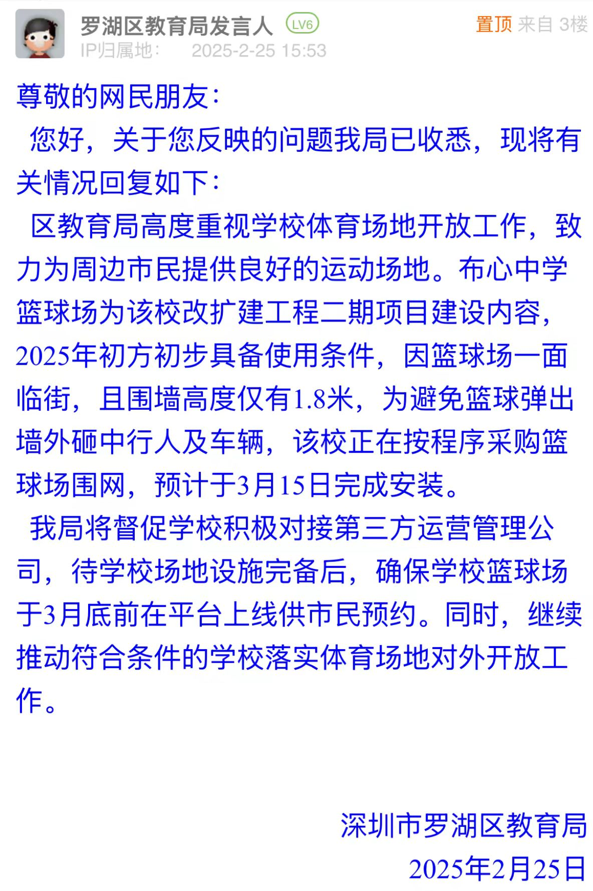 案例點評:市民關注布心中學籃球場開放時間,反映出對公共運動空間的迫切需求。羅湖區(qū)教育局詳細說明場地未開放原因及施工節(jié)點,并明確后續(xù)開放計劃,有效化解群眾疑慮,有助于“全民健身”政策更好落地。