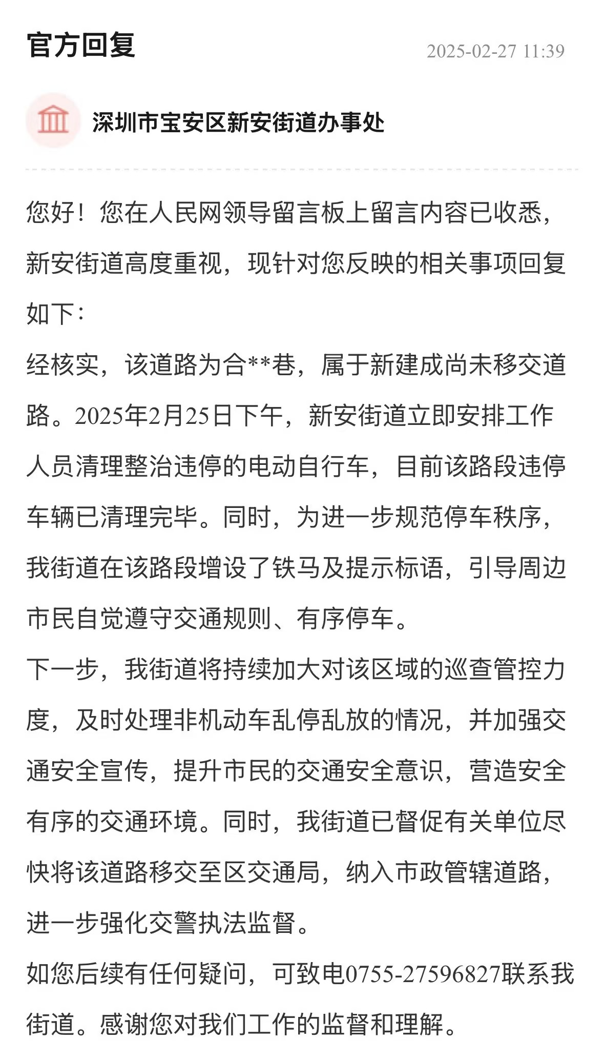 案例點評:非機動車亂停放影響交通和消防安全,嚴重影響市民生活。街道辦行動迅速,第一時間清理違停車輛,增設鐵馬及提示標語,規(guī)范停車秩序,展現(xiàn)了高效的處置能力?;貞校值肋€制定了長效治理計劃,構建“短期整治+長效管理”模式,有助于解決區(qū)域交通問題,提升城市管理水平。