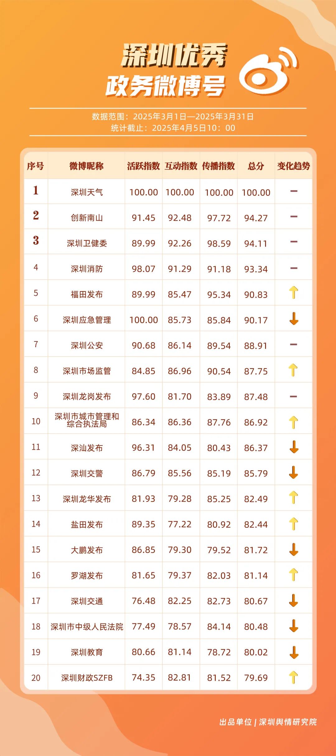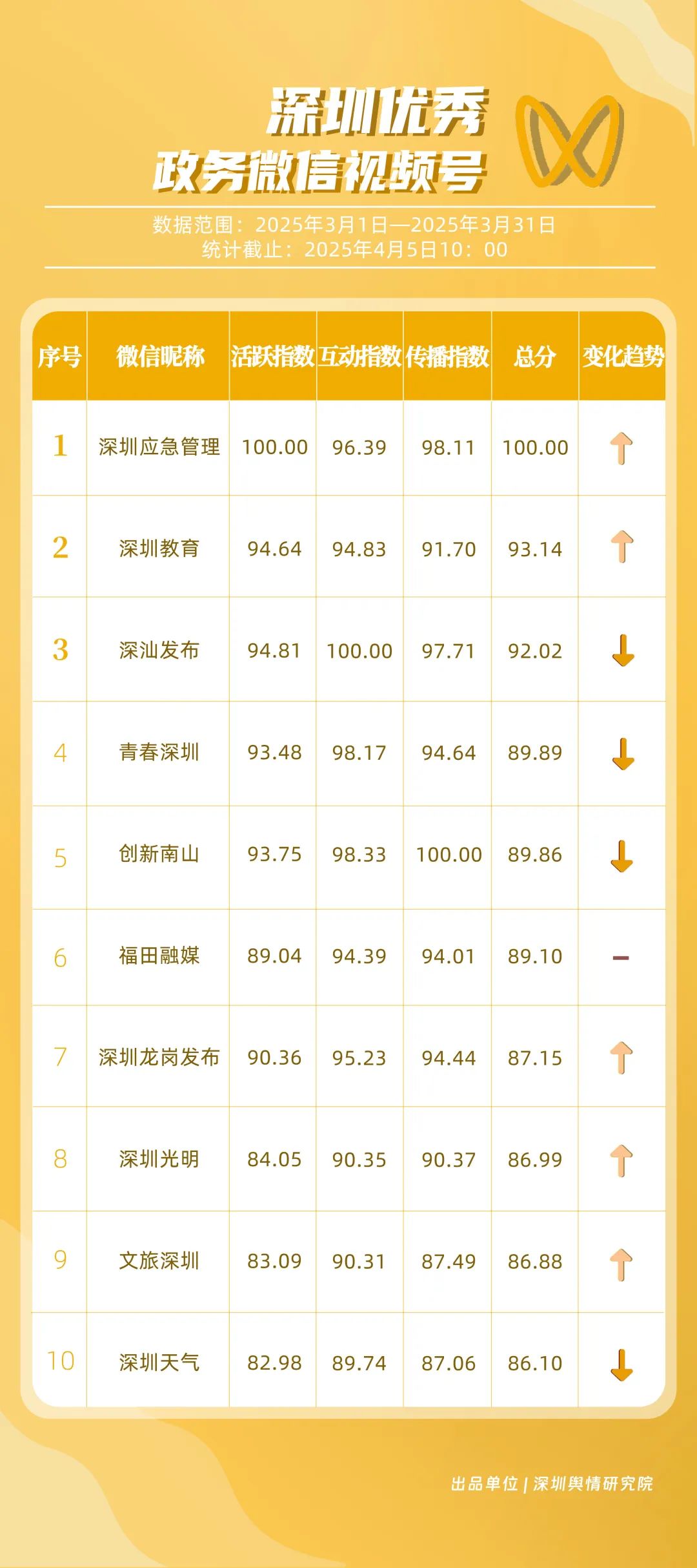 3月,市衛(wèi)生健康委、龍崗區(qū)、市氣象局、深汕特別合作區(qū)、南山區(qū)、福田區(qū)、市應(yīng)急管理局、龍華區(qū)、寶安區(qū)、光明區(qū)榮登“深圳優(yōu)秀政務(wù)新媒體矩陣”榜單。3月,市衛(wèi)生健康委新媒體矩陣持續(xù)關(guān)注市民身心健康,發(fā)布健康科普內(nèi)容,穩(wěn)居榜單第一位;龍崗區(qū)新媒體矩陣在抖音、微信視頻號(hào)平臺(tái)發(fā)力宣傳,躍居榜單第二位;市氣象局新媒體矩陣在微博平臺(tái)連續(xù)多期獲得滿分,持續(xù)以氣象預(yù)警與生活指南結(jié)合的內(nèi)容模式,為市民帶來(lái)便利信息。以上賬號(hào)在“深圳優(yōu)秀政務(wù)新媒體矩陣”榜單中榮獲前三名。此外,深汕特別合作區(qū)新媒體矩陣積極發(fā)布網(wǎng)絡(luò)熱點(diǎn)內(nèi)容,收獲較多網(wǎng)民關(guān)注分享;南山區(qū)新媒體矩陣多平臺(tái)實(shí)力強(qiáng)勁,以88.37分居于榜單第五位。值得關(guān)注的是,寶安區(qū)新媒體矩陣時(shí)隔多期躋身榜單前十名,多平臺(tái)均衡發(fā)展成效初顯。