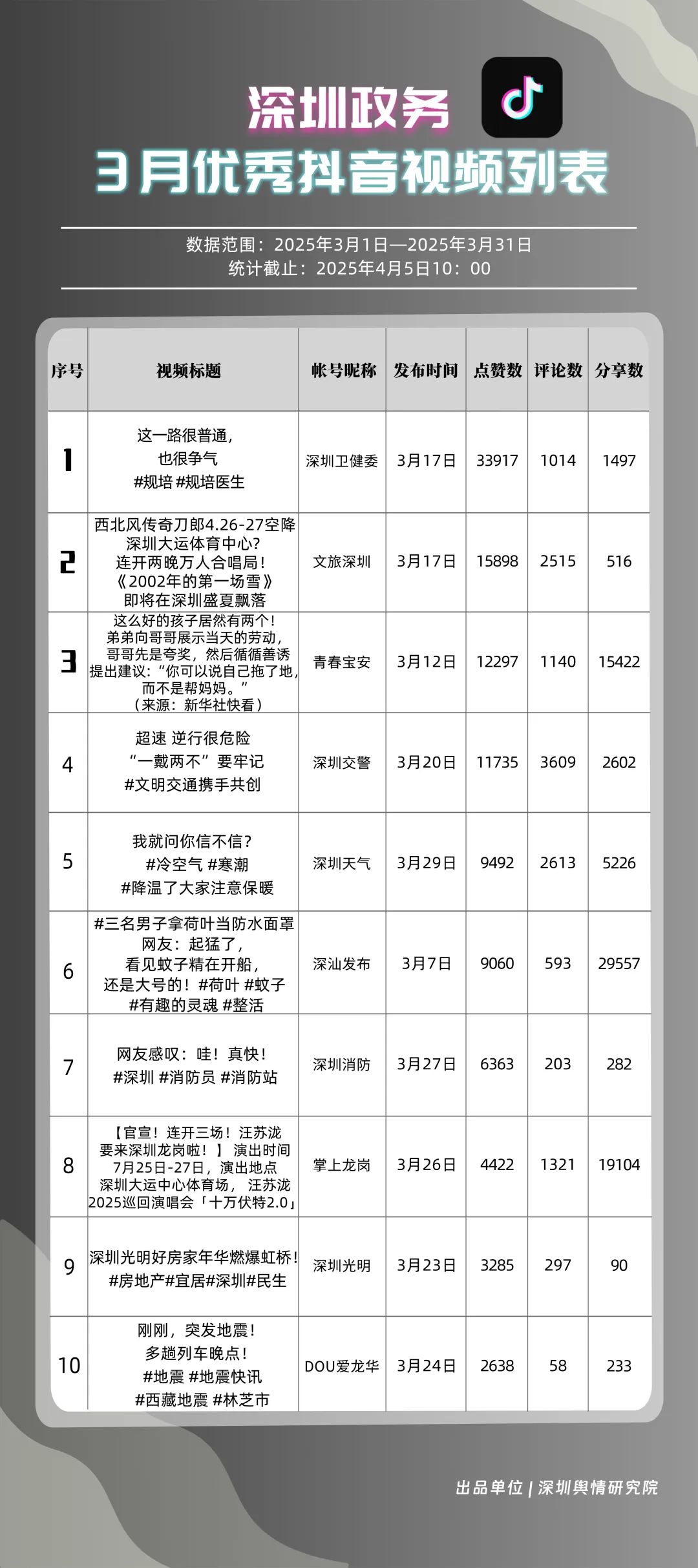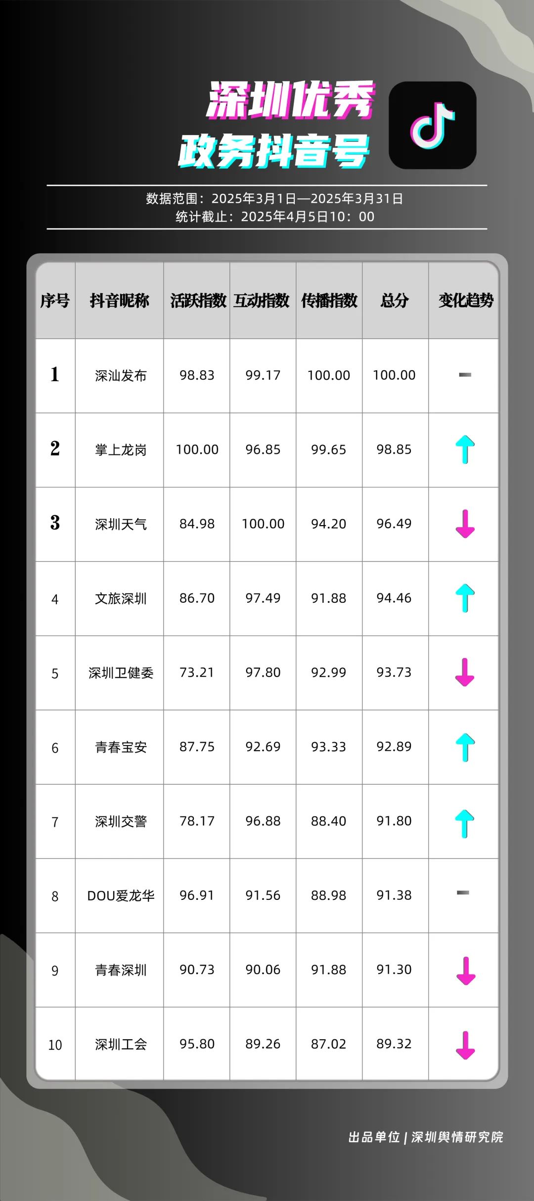 3月,“深汕發(fā)布”“掌上龍崗”“深圳天氣”“文旅深圳”“深圳衛(wèi)健委”“青春寶安”“深圳交警”“DOU愛(ài)龍華”“青春深圳”“深圳工會(huì)”共10個(gè)政務(wù)抖音號(hào)獲得“深圳優(yōu)秀政務(wù)抖音號(hào)”稱號(hào)。其中,“深汕發(fā)布”位于榜單第一名,3月共收獲5萬(wàn)余次點(diǎn)贊、8萬(wàn)余次轉(zhuǎn)發(fā),反映出賬號(hào)作品的較高吸引力;“深圳龍崗”以98.85分位于榜單第二名,與榜首分差微小,整體實(shí)力不俗。緊隨其后的分別是“深圳天氣”“文旅深圳”“深圳衛(wèi)健委”,三賬號(hào)產(chǎn)出內(nèi)容優(yōu)質(zhì),也獲得較高評(píng)分。相關(guān)上榜單位展現(xiàn)了深圳政務(wù)新媒體賬號(hào)在短視頻傳播領(lǐng)域的創(chuàng)新探索力與傳播實(shí)效性。
