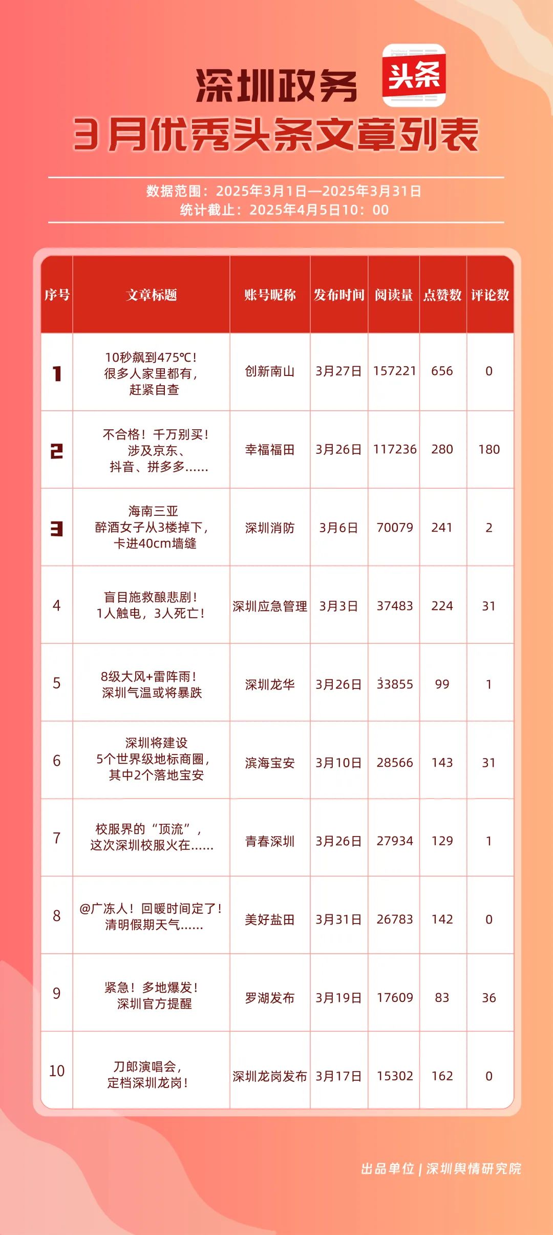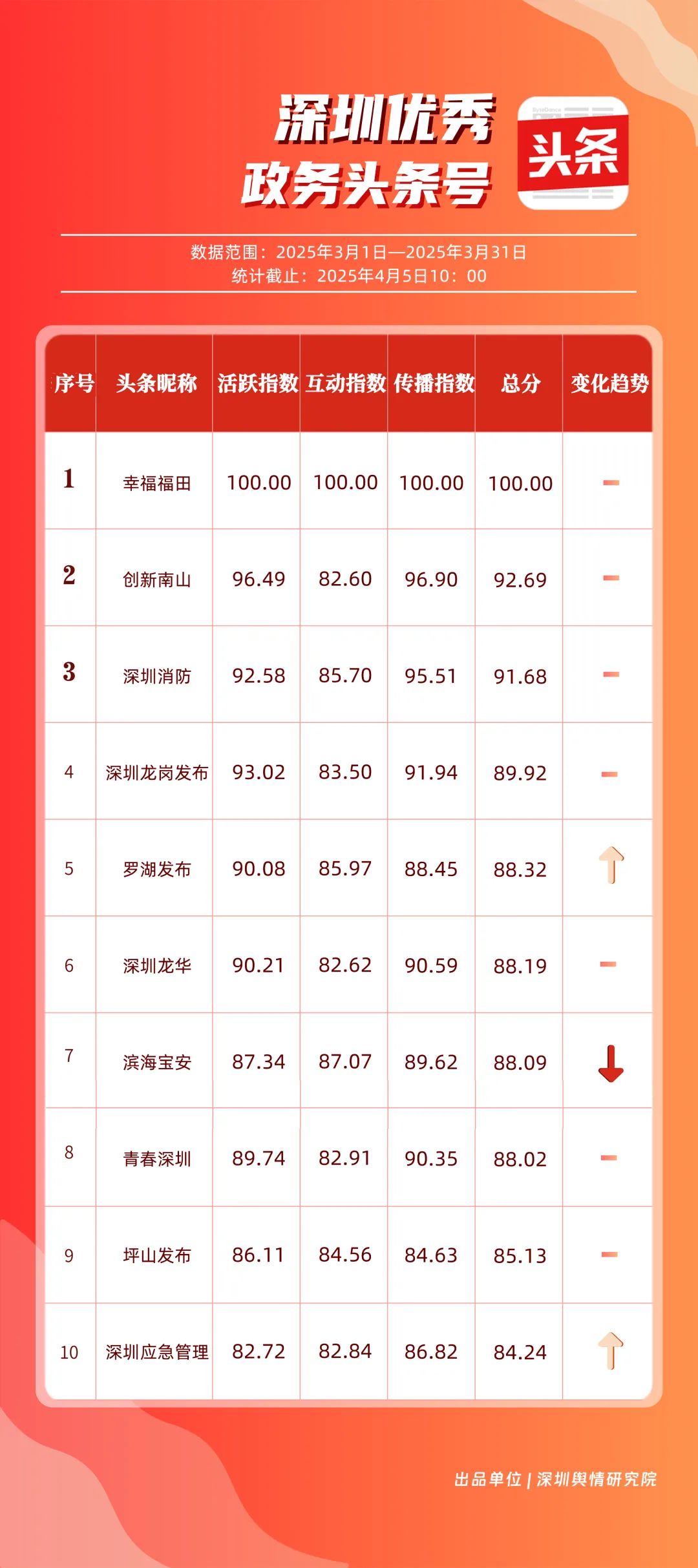 3月,“幸福福田”“創(chuàng)新南山”“深圳消防”“深圳龍崗發(fā)布”“羅湖發(fā)布”“深圳龍華”“濱海寶安”“青春深圳”“坪山發(fā)布”“深圳應(yīng)急管理”共10個(gè)政務(wù)頭條號(hào)入選“優(yōu)秀政務(wù)頭條號(hào)”榜單。上榜賬號(hào)中,“幸福福田”“創(chuàng)新南山”“深圳消防”“深圳龍崗發(fā)布”在頭條平臺(tái)排名較為穩(wěn)固,排名未產(chǎn)生變動(dòng)。當(dāng)月,“深圳應(yīng)急管理”以84.24分躋身榜單前十。