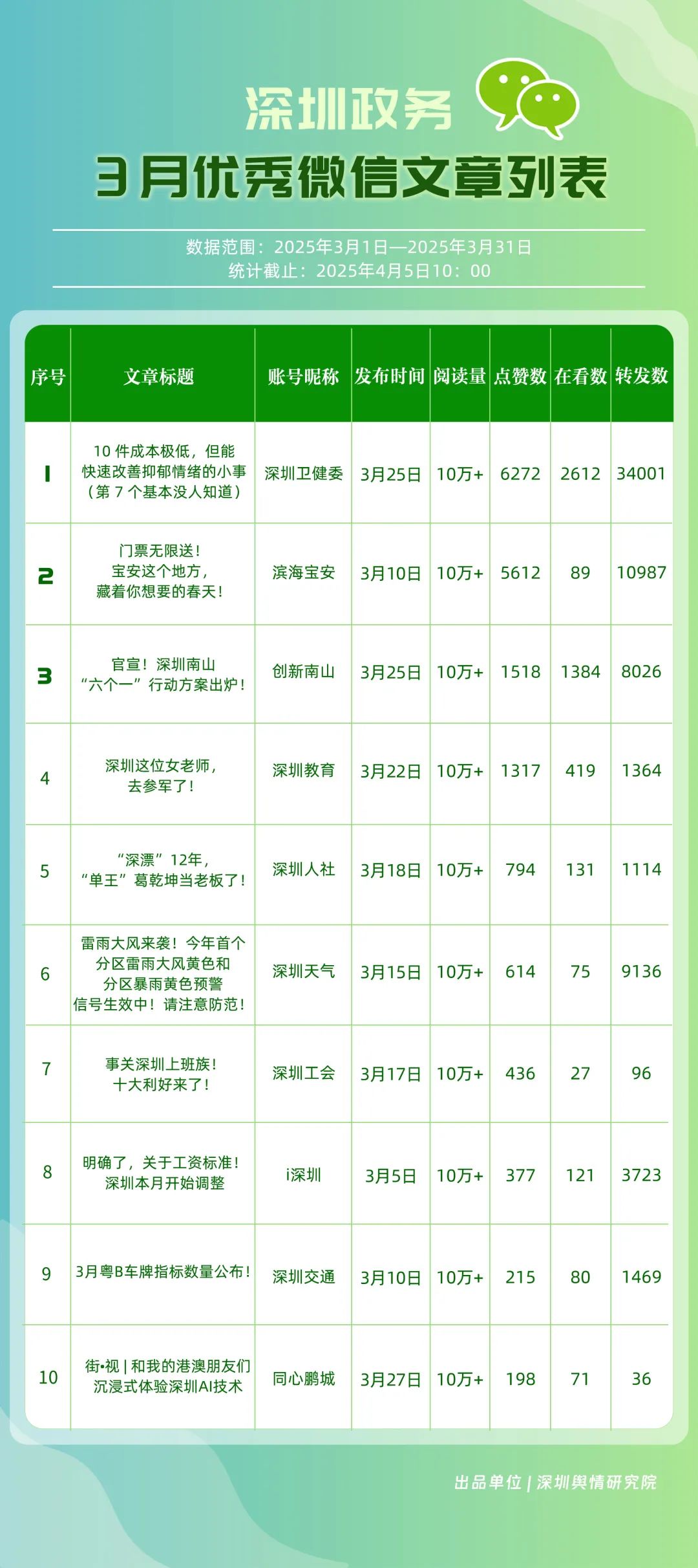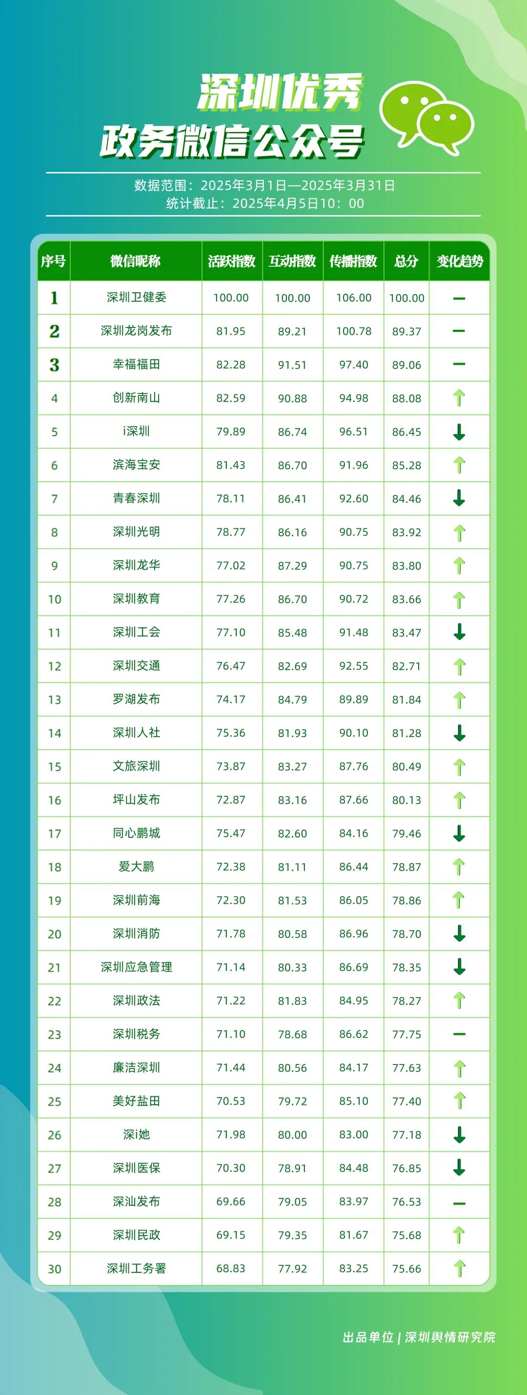 3月,包括“深圳衛(wèi)健委”“深圳龍崗發(fā)布”“幸福福田”“創(chuàng)新南山”“i深圳”“濱海寶安”“青春深圳”“深圳光明”“深圳龍華”“深圳教育”等在內(nèi)的30個(gè)賬號(hào)入選“深圳優(yōu)秀政務(wù)微信公眾號(hào)”。其中,“深圳衛(wèi)健委”超70篇文章閱讀量達(dá)10萬(wàn)次以上,穩(wěn)居榜單首位;“深圳龍崗發(fā)布”也取得較好傳播效果,在3月產(chǎn)出10余篇閱讀量超10萬(wàn)次的熱門文章,位于榜單第二位;“幸福福田”也積極發(fā)布高質(zhì)量?jī)?nèi)容,穩(wěn)住榜單第三位置;緊隨其后的是“創(chuàng)新南山”“i深圳”“濱海寶安”,總分均在85分以上。這充分展現(xiàn)了深圳新媒體傳播生態(tài)體系中,各主體的傳播優(yōu)勢(shì)與影響力版圖正逐漸凸顯。