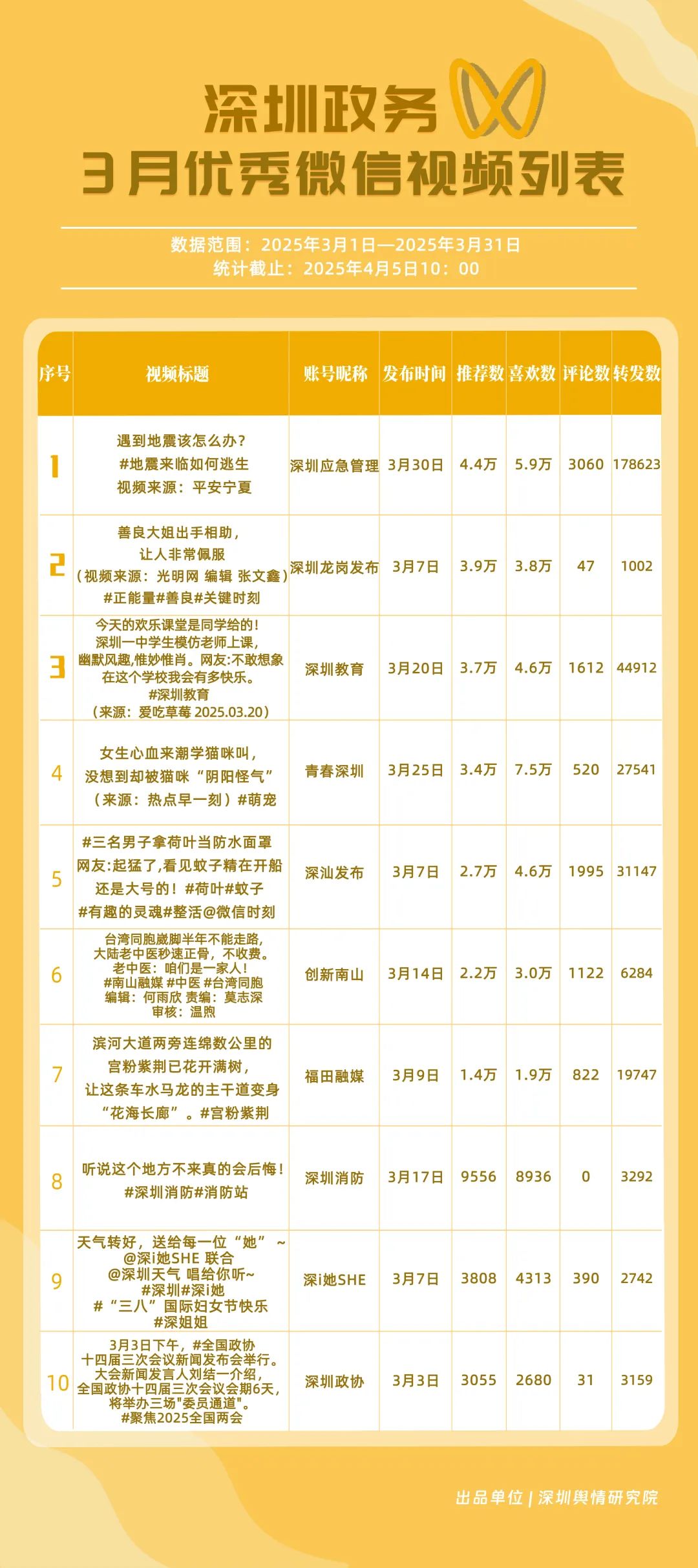 3月,獲“深圳優(yōu)秀政務(wù)微信視頻號(hào)”稱號(hào)的分別是“深圳應(yīng)急管理”“深圳教育”“深汕發(fā)布”“青春深圳”“創(chuàng)新南山”“福田融媒”“深圳龍崗發(fā)布”“深圳光明”“文旅深圳”“深圳天氣”。其中,“深圳應(yīng)急管理”以20余篇作品收獲超20萬(wàn)次轉(zhuǎn)發(fā),躍居第一名,一期有關(guān)“地震來(lái)臨如何逃生”的視頻收獲超17萬(wàn)次轉(zhuǎn)發(fā),展現(xiàn)了其內(nèi)容的高實(shí)用性?!吧钲诮逃薄吧钌前l(fā)布”位于榜單第二、三位,總分超90分,反映出兩賬號(hào)在民生教育、區(qū)域宣傳領(lǐng)域擁有較好傳播效果。“青春深圳”“創(chuàng)新南山”“福田融媒”等賬號(hào)也在3月發(fā)布優(yōu)質(zhì)視頻內(nèi)容,展現(xiàn)了深圳政務(wù)新媒體在視頻號(hào)平臺(tái)宣傳的創(chuàng)新探索。