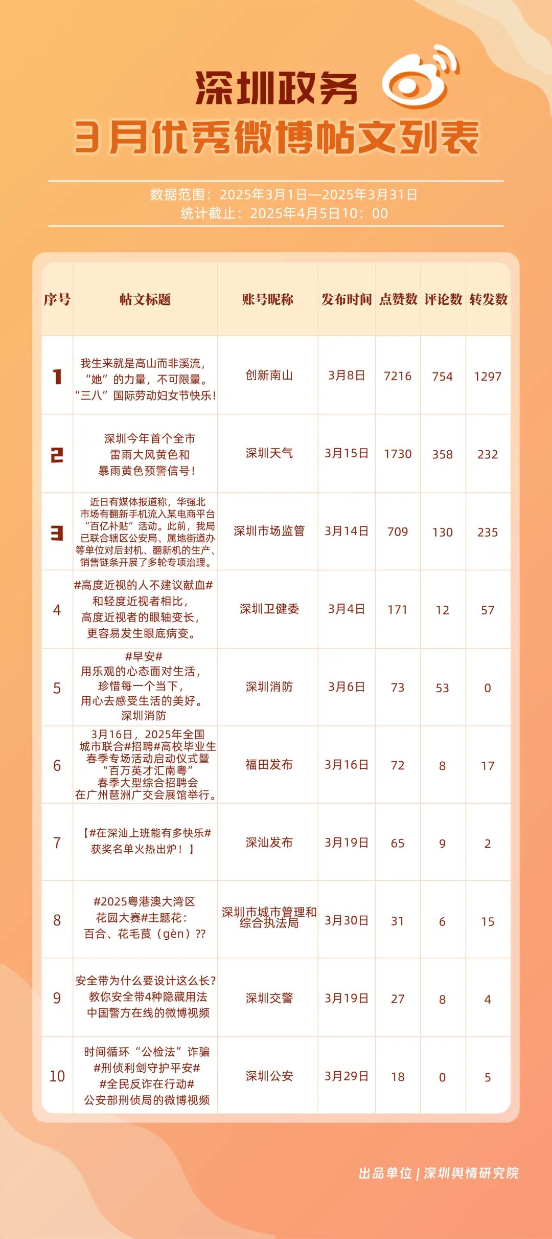 3月,“深圳天氣”“創(chuàng)新南山”“深圳衛(wèi)健委”“深圳消防”“福田發(fā)布”“深圳應(yīng)急管理”“深圳公安”“深圳市場(chǎng)監(jiān)管”“深圳龍崗發(fā)布”“深圳市城市管理和綜合執(zhí)法局”等20個(gè)賬號(hào)入選“優(yōu)秀政務(wù)微博號(hào)”。值得一提的是,“深圳天氣”賬號(hào)在3月共獲得點(diǎn)贊超11萬(wàn),相較其他賬號(hào)具備顯著優(yōu)勢(shì)?!皠?chuàng)新南山”“深圳衛(wèi)健委”“深圳消防”也位列前茅,分差微小,競(jìng)爭(zhēng)激烈。從領(lǐng)域分布來(lái)看,上榜賬號(hào)不僅包括區(qū)級(jí)賬號(hào),還涵蓋民生服務(wù)、應(yīng)急科普、城市治理等單位賬號(hào),體現(xiàn)了深圳政務(wù)新媒體在多領(lǐng)域的強(qiáng)大影響力。