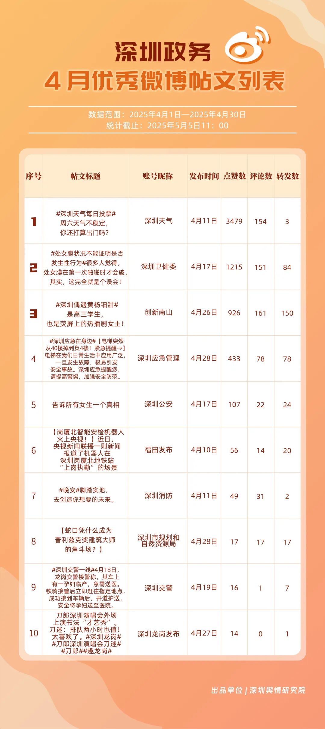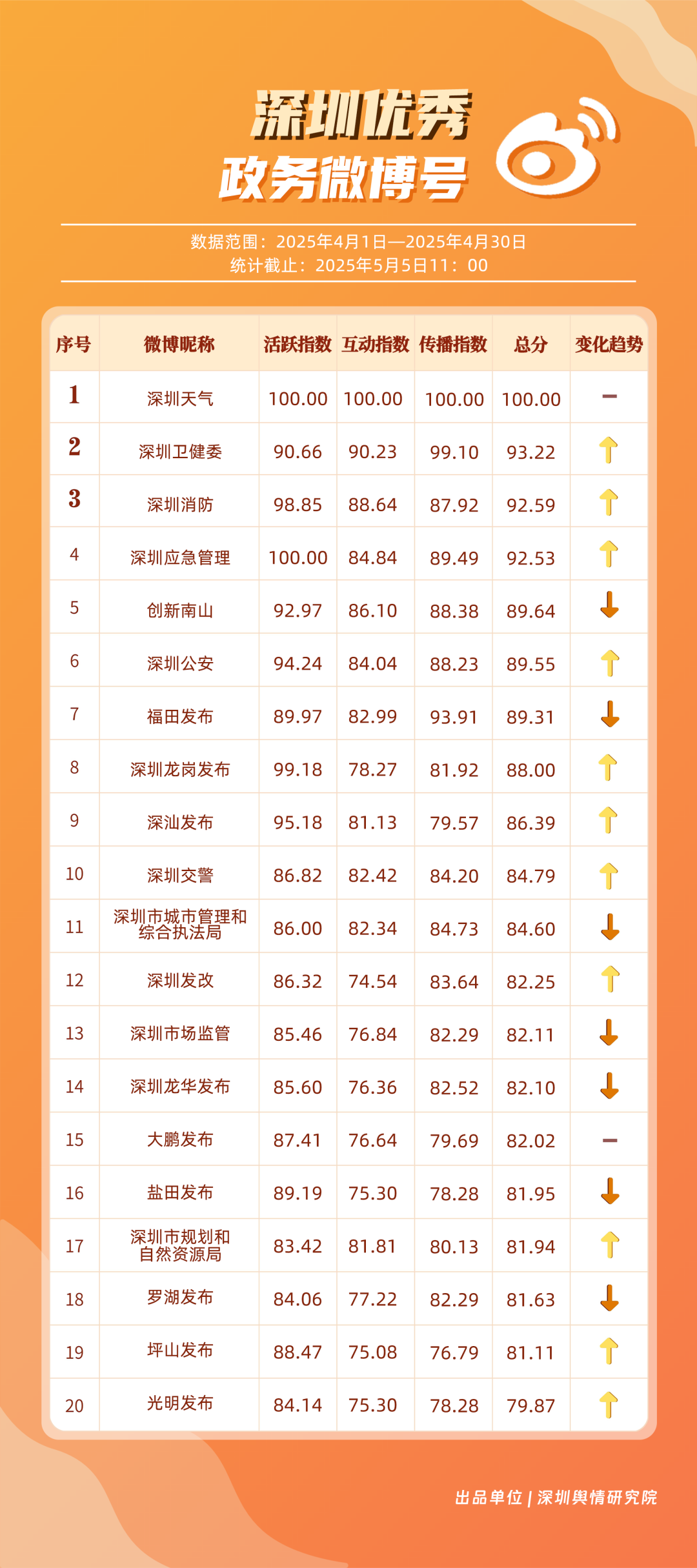 4月,“深圳天氣”“深圳衛(wèi)健委”“深圳消防”“深圳應急管理”“創(chuàng)新南山”“深圳公安”“福田發(fā)布”“深圳龍崗發(fā)布”“深汕發(fā)布”“深圳交警”等20個賬號入選“優(yōu)秀政務微博號”。值得一提的是,“深圳天氣”在多個指標中獲得滿分,其氣象信息的趣味性和實用性受到市民認可;“深圳衛(wèi)健委”“深圳消防”“深圳應急管理”也在信息傳播、互動服務等方面持續(xù)發(fā)力,以超過90分的總分緊跟其后;“深汕發(fā)布”“深圳交警”相較于3月在榜單排名有所提升,展現出強勁的發(fā)展勢頭。這些優(yōu)秀政務微博號的脫穎而出,不僅體現了各自的運營實力,更反映出深圳政務新媒體在微博平臺的蓬勃發(fā)展態(tài)勢。