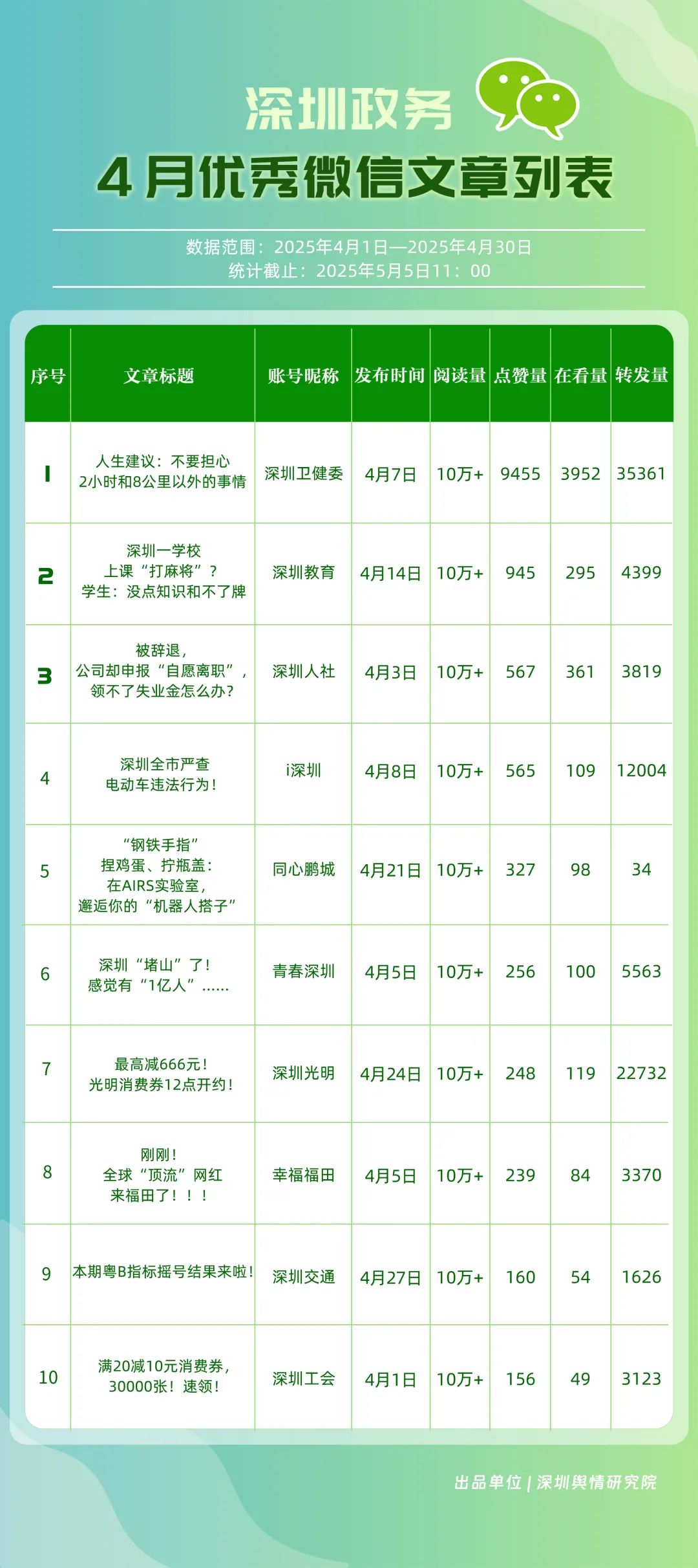 4月,包括“深圳衛(wèi)健委”“深圳龍崗發(fā)布”“幸福福田”“深圳光明”“i深圳”“創(chuàng)新南山”“青春深圳”“深圳交通”“深圳教育”“濱海寶安”等在內的30個賬號入選“深圳優(yōu)秀政務微信公眾號”。其中,“深圳衛(wèi)健委”在活躍指數、互動指數、傳播指數上均拿到滿分,4月共有67篇推文閱讀量超10萬次,綜合得分穩(wěn)居榜單首位;“深圳龍崗發(fā)布”同樣表現亮眼,4月共產出13篇閱讀量超10萬次的爆款文章,綜合得分排名第二位;“幸福福田”則憑借持續(xù)輸出的高質量內容,排在榜單第三位?!吧钲诠饷鳌薄癷深圳”“創(chuàng)新南山”“青春深圳”也憑借扎實的內容功底與良好的運營策略,總分超85分。上榜賬號的亮眼成績,不僅彰顯了各自的傳播優(yōu)勢,更展現出各新媒體矩陣在微信公眾平臺的傳播勢能正持續(xù)攀升。