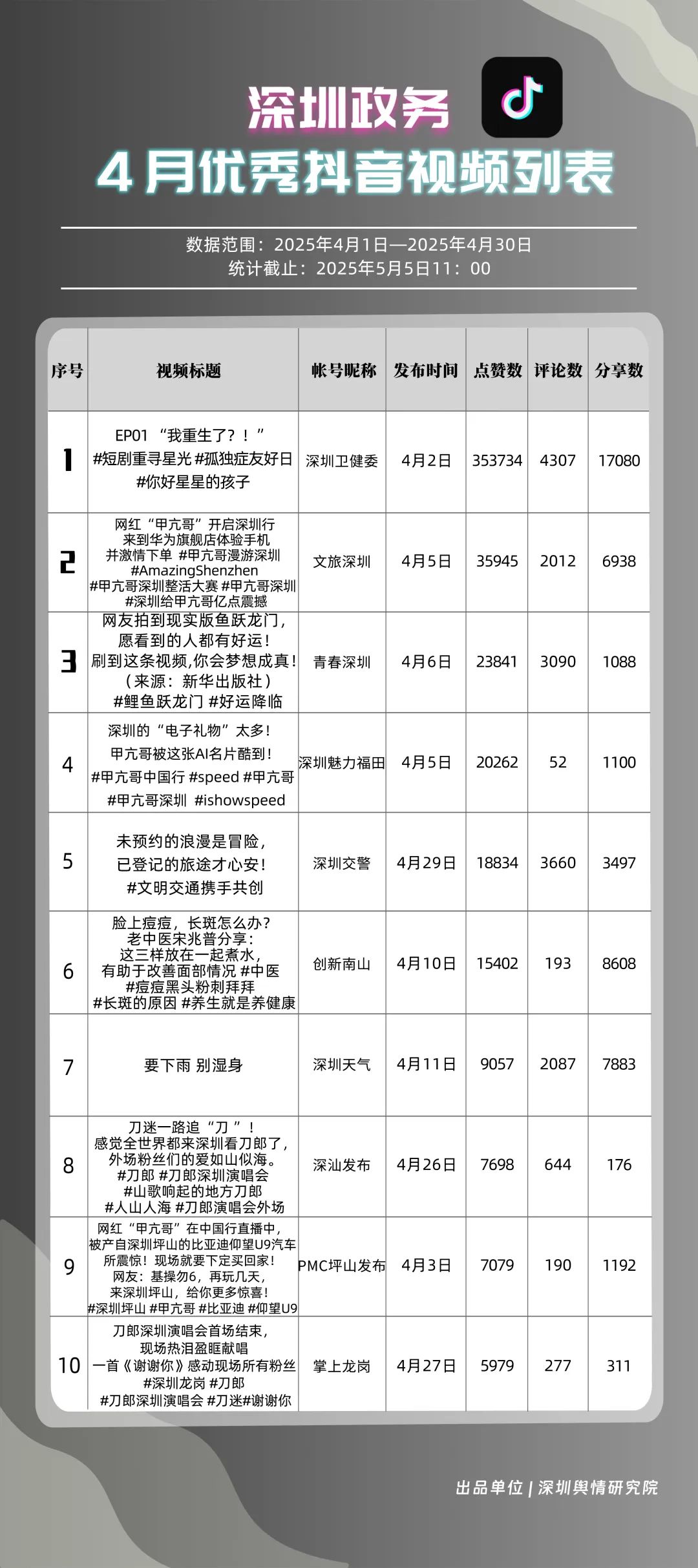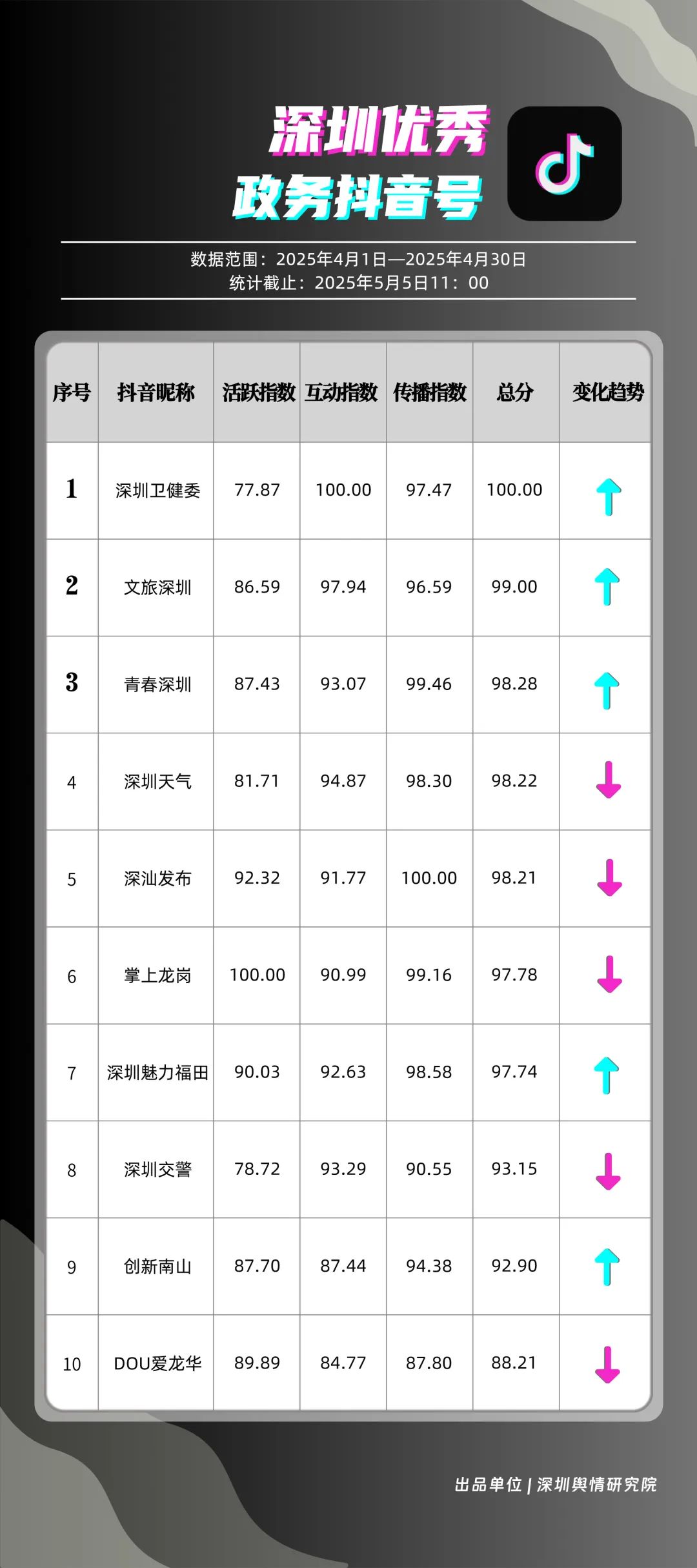 4月,“深圳衛(wèi)健委”“文旅深圳”“青春深圳”“深圳天氣”“深汕發(fā)布”“掌上龍崗”“深圳魅力福田”“深圳交警”“創(chuàng)新南山”“DOU愛龍華”共10個政務抖音號獲得“優(yōu)秀政務抖音號”稱號。4月,“深圳衛(wèi)健委”“文旅深圳”“青春深圳”憑借新穎的內容策劃、生動的短視頻呈現方式,實現排名提升,位居榜單前三?!吧钲谔鞖狻薄吧钌前l(fā)布”緊隨其后,以優(yōu)質實用的內容、接地氣的表達,持續(xù)擴大政務新媒體的傳播聲量。上榜賬號積極探索創(chuàng)新傳播路徑,以生動有趣的方式傳遞政務信息,為深圳政務新媒體在短視頻領域的發(fā)展注入新活力。
