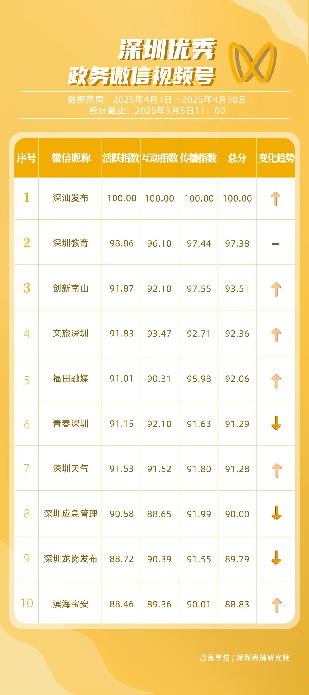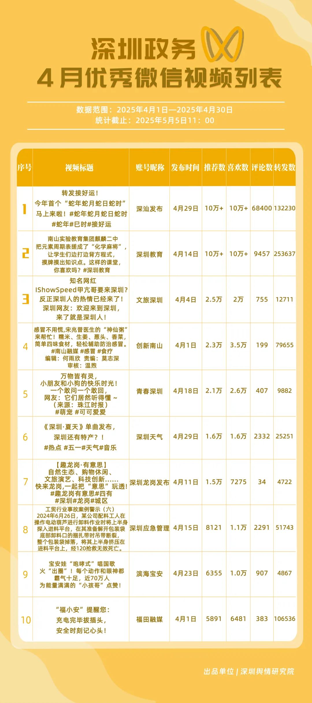 4月,獲“深圳優(yōu)秀政務微信視頻號”稱號的是“深汕發(fā)布”“深圳教育”“創(chuàng)新南山”“文旅深圳”“福田融媒”“青春深圳”“深圳天氣”“深圳應急管理”“深圳龍崗發(fā)布”“濱海寶安”。其中,“深汕發(fā)布”憑借亮眼的數據表現成為榜首,其一條有關“蛇年蛇月蛇日蛇時”的視頻作品點贊量超10萬次、評論量超6.8萬次,轉發(fā)量超13萬次;“深圳教育”持續(xù)穩(wěn)定輸出優(yōu)質內容,以扎實的運營實力鞏固自身影響力,位居榜單第2位;“創(chuàng)新南山”“文旅深圳”“福田融媒”分別位列榜單第3、4、5位,總分超92分,在區(qū)域形象宣傳、文旅資源推廣等方面展現出卓越的傳播效能,成為傳遞區(qū)域特色與發(fā)展動態(tài)的重要窗口。