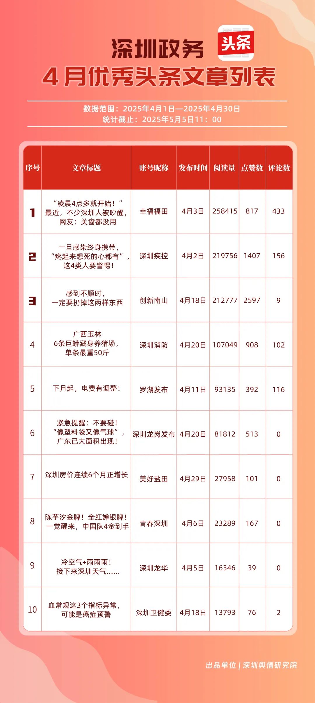 4月,“幸福福田”“深圳疾控”“創(chuàng)新南山”“深圳消防”“羅湖發(fā)布”“深圳龍崗發(fā)布”“坪山發(fā)布”“深圳龍華”“青春深圳”“濱海寶安”共10個政務頭條號入選“優(yōu)秀政務頭條號”榜單?!靶腋8L铩毖永m(xù)上月的優(yōu)異表現,以優(yōu)質的內容輸出和穩(wěn)定的用戶互動,位列榜單首位,成為政務頭條號的標桿;“深圳疾控”則以92.39分的亮眼成績排在榜單第二位,凸顯了政務新媒體在公共衛(wèi)生領域的傳播成果;“創(chuàng)新南山”“深圳消防”“羅湖發(fā)布”緊隨其后,分別在城區(qū)形象宣傳、消防安全領域等方面深耕細作,持續(xù)擴大政務信息的覆蓋面與影響力。
