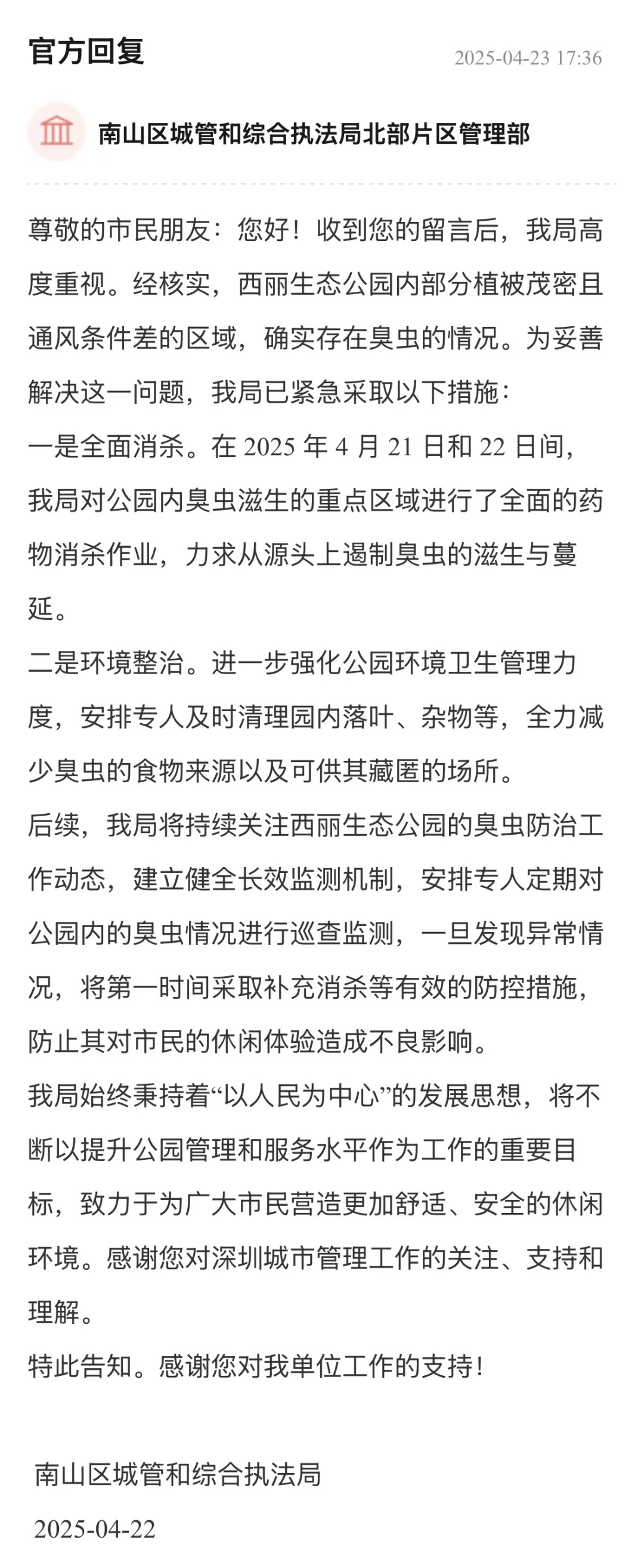 案例點(diǎn)評(píng):臭蟲侵?jǐn)_住戶問(wèn)題與居民生活舒適度息息相關(guān)。南山區(qū)城管部門快速響應(yīng),在問(wèn)題反饋后48小時(shí)內(nèi)即開(kāi)展消殺,遏制臭蟲蔓延;同步強(qiáng)化環(huán)境整治,切斷滋生鏈條。更值得肯定的是,回應(yīng)中還表示將建立健全長(zhǎng)效監(jiān)測(cè)機(jī)制,動(dòng)態(tài)跟蹤蟲情并及時(shí)采取措施,充分體現(xiàn)出該局問(wèn)題發(fā)現(xiàn)快、處置措施實(shí)、長(zhǎng)效保障穩(wěn)的務(wù)實(shí)作風(fēng)。