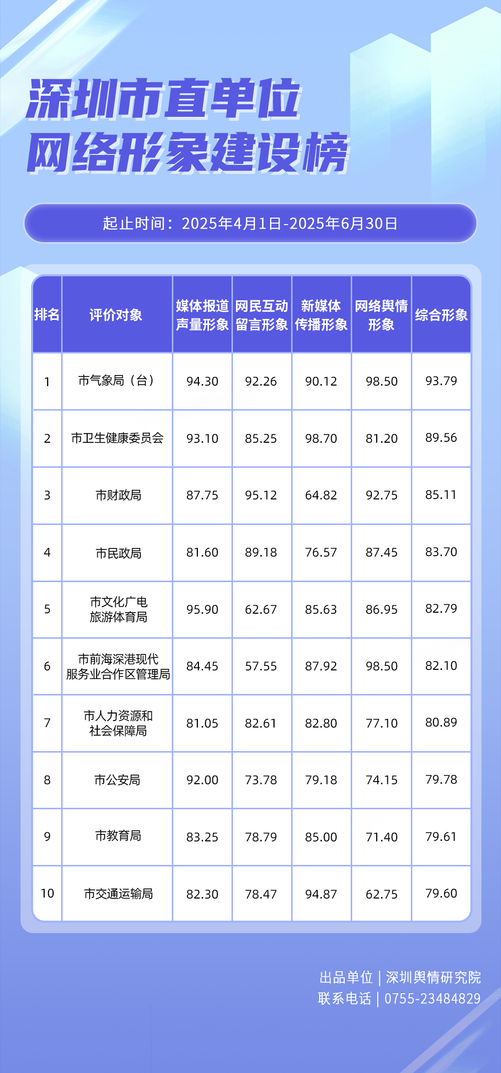 1. 深圳市直單位網(wǎng)絡(luò)形象建設(shè)榜:從媒體報道聲量形象、網(wǎng)民互動留言形象、新媒體傳播形象、網(wǎng)絡(luò)輿情形象四個維度入手,考量深圳市直單位的正向媒體報道數(shù)量、網(wǎng)民留言傾向、宣傳策劃質(zhì)效與輿情化解能力等多個層面,評估各單位的網(wǎng)絡(luò)綜合形象指數(shù)。在最終計算時,各維度的權(quán)重占比均為25%。