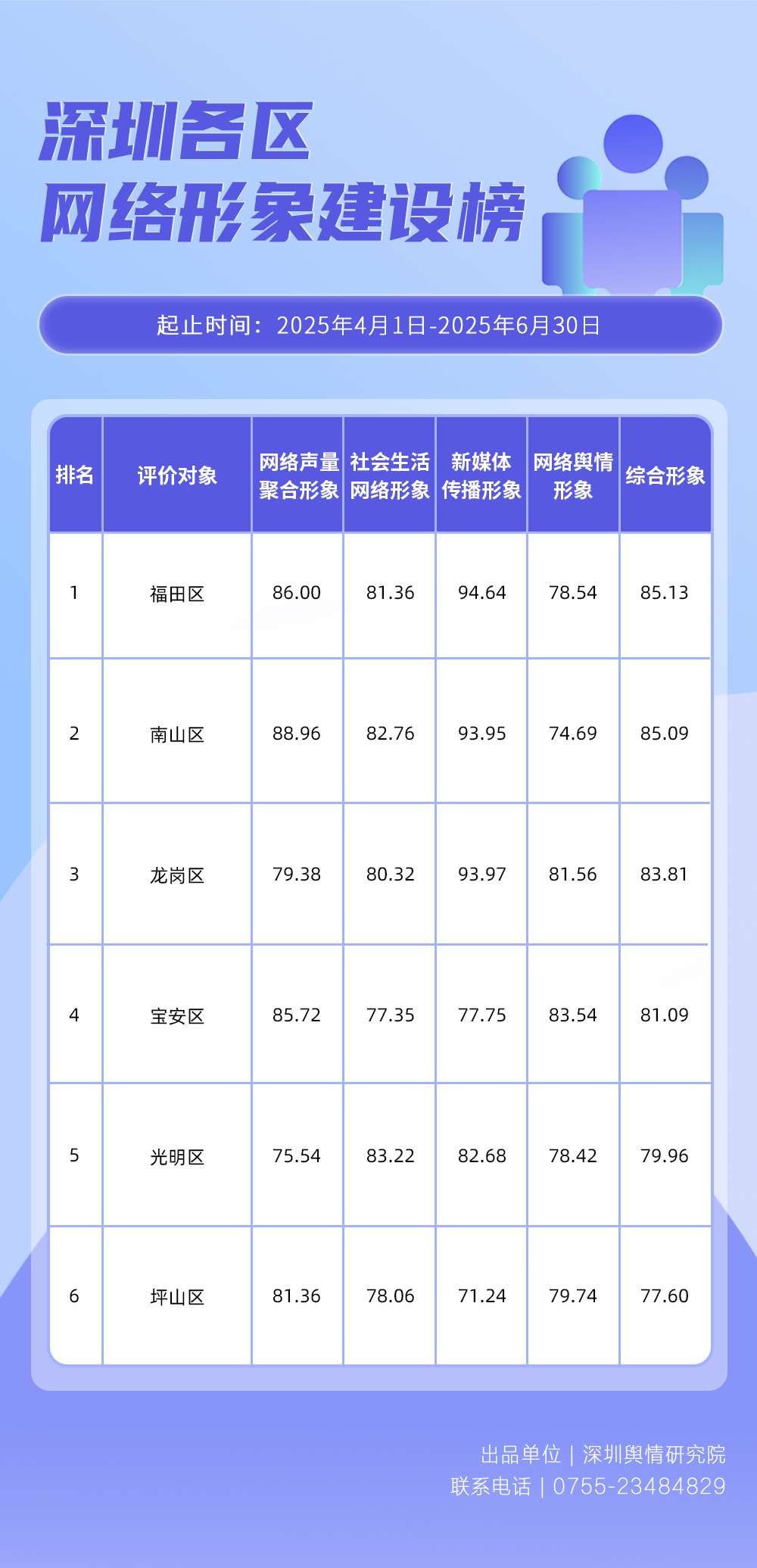 4-6月,福田區(qū)、南山區(qū)、龍崗區(qū)、寶安區(qū)、光明區(qū)、坪山區(qū)登上榜單前六。其中,福田區(qū)、南山區(qū)、龍崗區(qū)位居榜單前三名,在新媒體傳播形象、社會生活網(wǎng)絡(luò)形象等多個指標(biāo)上表現(xiàn)出色,綜合評價分值在85分左右。寶安區(qū)、光明區(qū)、坪山區(qū)緊隨其后,在各項網(wǎng)絡(luò)形象建設(shè)工作中持續(xù)發(fā)力,彰顯出了各區(qū)網(wǎng)絡(luò)形象建設(shè)的協(xié)同共進之態(tài)。