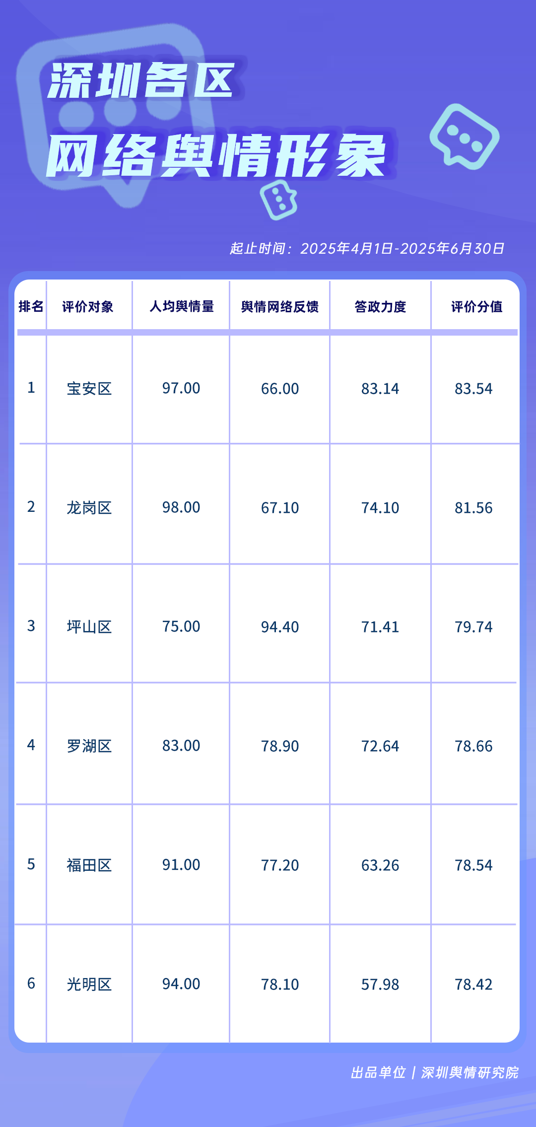 4-6月,在網(wǎng)絡(luò)輿情方面,寶安區(qū)、龍崗區(qū)憑借較低的人均輿情量、較好的答政效果,位居榜單前二;坪山區(qū)、羅湖區(qū)、福田區(qū)、光明區(qū)也躋身前列,以優(yōu)異分?jǐn)?shù)展現(xiàn)其在網(wǎng)絡(luò)輿情工作中的積極成效,彰顯了各區(qū)在營造良好網(wǎng)絡(luò)輿情環(huán)境、及時回應(yīng)網(wǎng)民訴求上的主動擔(dān)當(dāng)。