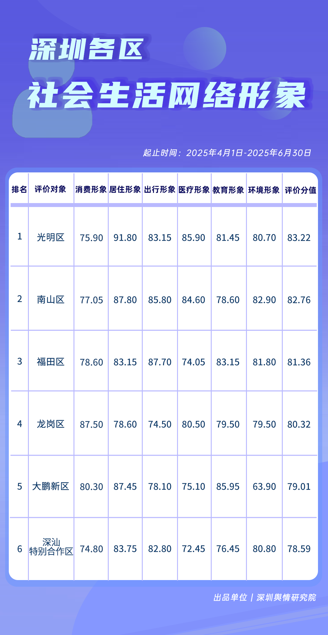 4-6月,《深圳各區(qū)社會生活網(wǎng)絡(luò)形象榜》中,光明區(qū)憑借在居住、醫(yī)療、出行等多方面的良好網(wǎng)絡(luò)呈現(xiàn),獲得較高綜合評價分值,南山區(qū)、福田區(qū)、龍崗區(qū)也表現(xiàn)優(yōu)異,四區(qū)綜合評價分值均超80分。大鵬新區(qū)、深汕特別合作區(qū)也在榜單中占據(jù)靠前位置,成為各區(qū)借助網(wǎng)絡(luò)力量增進民生福祉、推動協(xié)調(diào)發(fā)展的生動展現(xiàn)。