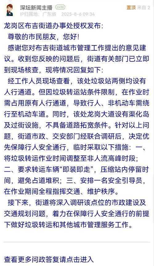 經(jīng)工作人員現(xiàn)場(chǎng)查看,該處垃圾站兩側(cè)均設(shè)有人行通道。但因垃圾轉(zhuǎn)運(yùn)站條件限制,在作業(yè)時(shí)需占用原有人行通道,導(dǎo)致行人、非機(jī)動(dòng)車需繞行至機(jī)動(dòng)車道。同時(shí),該處龍崗大道設(shè)有渠化島及過(guò)街設(shè)施,不具備道路拓寬條件。針對(duì)以上問題,街道市政、交安部門經(jīng)聯(lián)合調(diào)研后,決定優(yōu)先保障行人安全通行,臨時(shí)采取以下措施:一、將垃圾轉(zhuǎn)運(yùn)作業(yè)時(shí)間調(diào)整至非人流高峰時(shí)段;二、要求轉(zhuǎn)運(yùn)車輛“即裝即走”,壓縮站內(nèi)停留時(shí)間,避免占道堆積;三、安排一名安全引導(dǎo)員,在作業(yè)期間全程指揮交通、維護(hù)秩序。