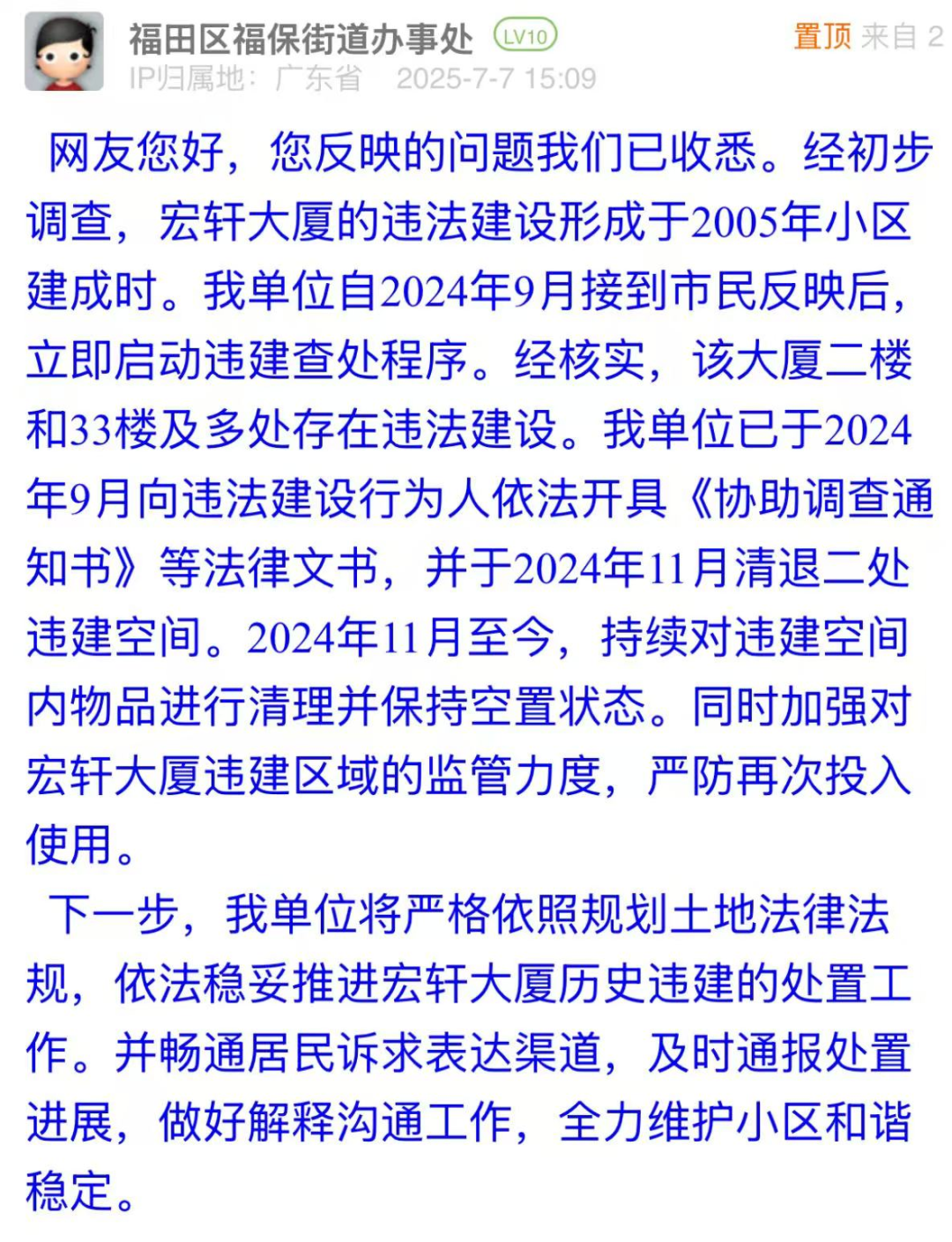 3、有市民反映福田區(qū)一大廈存在違建,希望有關(guān)部門關(guān)注處理