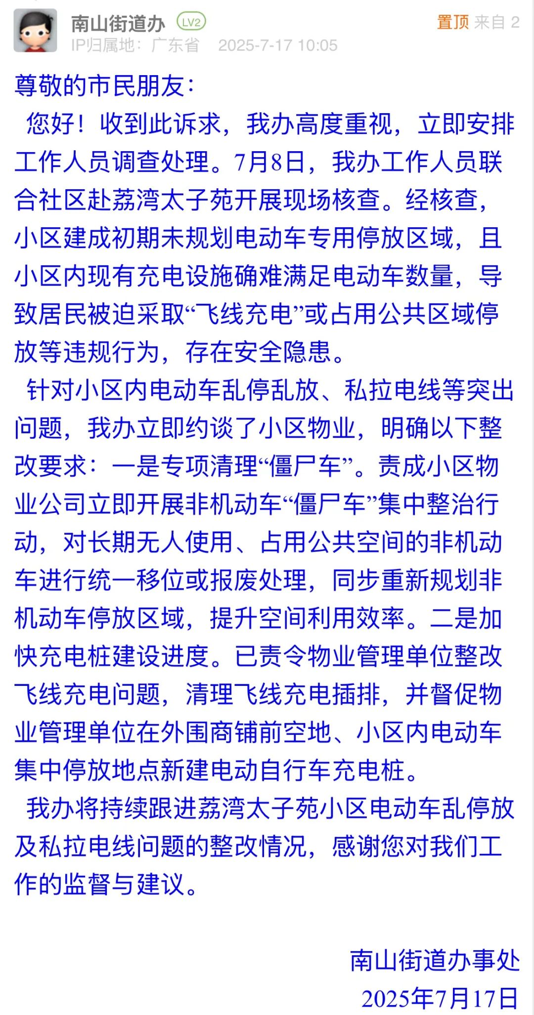 針對小區(qū)內(nèi)電動(dòng)車亂停放、私拉電線等存在安全隱患的行為,南山街道辦接訴后迅速聯(lián)合社區(qū)核查,說明了歷史規(guī)劃不足的核心病因,通過約談物業(yè)推動(dòng)整改,從“應(yīng)急響應(yīng)”到“系統(tǒng)治理”的務(wù)實(shí)舉措,回應(yīng)了市民對消防通道暢通、用電安全的關(guān)切,以“標(biāo)本兼治”的治理思路,為老舊小區(qū)電動(dòng)車管理提供了可復(fù)制的解決方案。