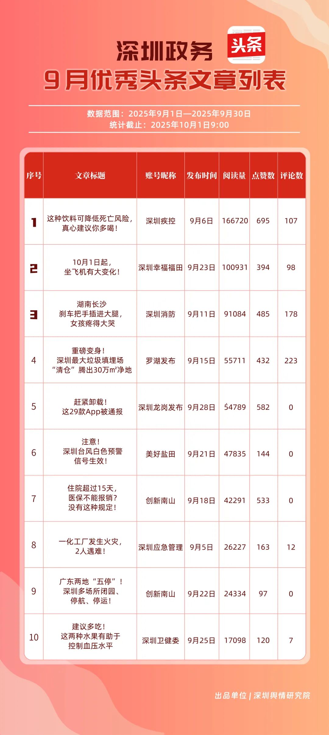 9月,“深圳幸福福田”“深圳疾控”“深圳消防”“羅湖發(fā)布”“深圳龍崗發(fā)布”“創(chuàng)新南山”“深圳龍華”“青春深圳”“深圳人社”“濱海寶安”共10個政務頭條號入選“優(yōu)秀政務頭條號”榜單?!吧钲谛腋8L铩狈€(wěn)居榜單首位,在傳播、互動等方面均表現(xiàn)卓越;“深圳疾控”關(guān)注民生健康,有關(guān)“喝茶的好處”“非正規(guī)醫(yī)美針風險”兩篇文章閱讀均超10萬次,為市民提供健康信息;“深圳消防”聚焦消防安全領(lǐng)域,提醒市民注意安全。相關(guān)上榜賬號表現(xiàn)優(yōu)異,注重內(nèi)容實用化、互動場景化,彰顯了政務新媒體的服務效能。