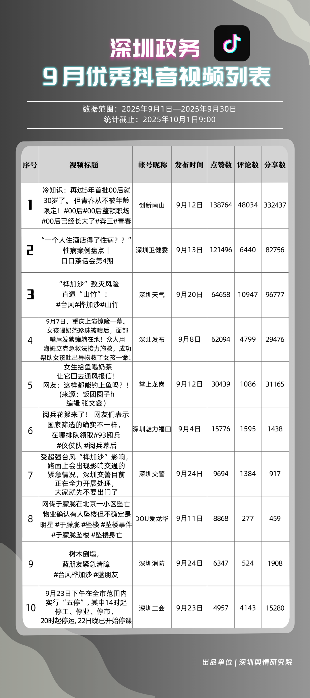 9月,深圳政務新媒體矩陣持續(xù)優(yōu)化內(nèi)容生態(tài),各單位依托平臺特色深化服務效能,南山區(qū)、市衛(wèi)生健康委員會、市氣象局(臺)、龍崗區(qū)、福田區(qū)、龍華區(qū)、深汕特別合作區(qū)、市應急管理局、中國共產(chǎn)主義青年團深圳市委員會、光明區(qū)的新媒體矩陣入選“深圳優(yōu)秀政務新媒體矩陣”榜單。9月,南山區(qū)在短視頻平臺表現(xiàn)突出,抖音、微信視頻號平臺均獲滿分;市衛(wèi)生健康委員會輸出深度內(nèi)容,位列榜單第二;市氣象局(臺)新媒體矩陣居于榜單第三,在9月發(fā)布臺風相關(guān)天氣提醒,獲得公眾廣泛關(guān)注。此外,龍崗區(qū)、福田區(qū)、龍華區(qū)、深汕特別合作區(qū)新媒體矩陣持續(xù)推出優(yōu)質(zhì)內(nèi)容,共同展現(xiàn)了深圳在塑造現(xiàn)代化形象、提升數(shù)字治理能力上的創(chuàng)新引領(lǐng)作用。