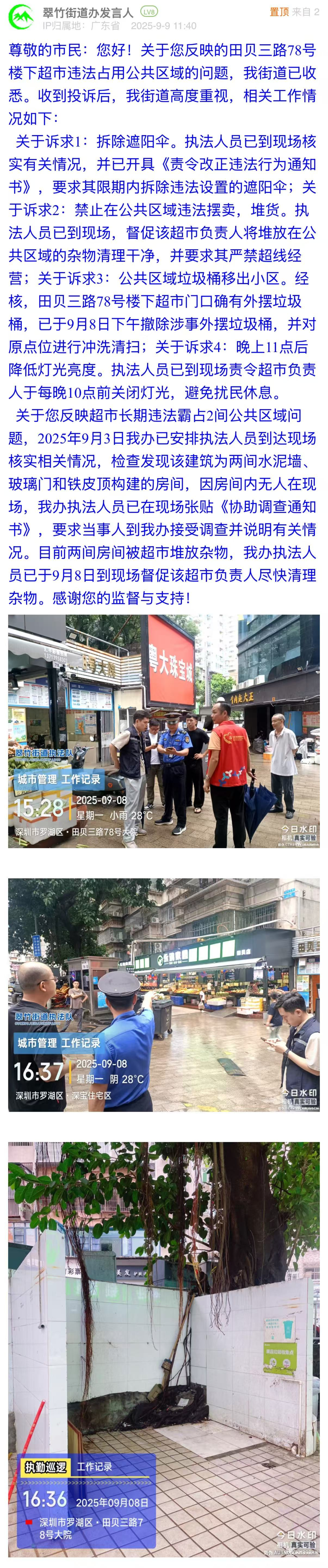 案例點評:本案例中,翠竹街道辦立足市民訴求,對違規(guī)搭建遮陽傘、占用公共區(qū)域、違規(guī)堆放垃圾、店面燈牌亮度過高這四個問題,街道均做到快速響應(yīng),并以圖片展示治理效果。回應(yīng)既體現(xiàn)了基層執(zhí)法的規(guī)范性與時效性,又展現(xiàn)了對民生細節(jié)的關(guān)注力,踐行了“小事不小辦、事事有回音”的理念,為同類民生訴求的解決提供了可借鑒范式。