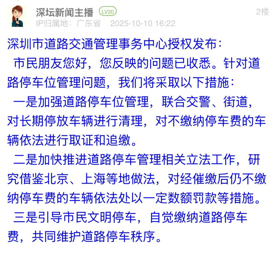 優(yōu)化建議:市民在帖文中反映,其此前的投訴件被標記為“辦結(jié)”,但霸位車輛依舊未被移走,現(xiàn)場問題未解決,質(zhì)疑相關(guān)部門執(zhí)行力不足。對于市民的再次投訴,深圳市道路交通管理事務(wù)中心的回應(yīng)存在公式化、未切實回應(yīng)市民核心關(guān)切的問題,僅以“加強管理”“推進立法”“引導(dǎo)文明停車”等回復(fù),難以消除公眾對治理執(zhí)行力的疑慮。建議后續(xù)強化回應(yīng)針對性,具體問題具體答復(fù),如公開執(zhí)法流程、提供處置證據(jù)等,以務(wù)實態(tài)度回應(yīng)市民監(jiān)督,提升治理公信力。
