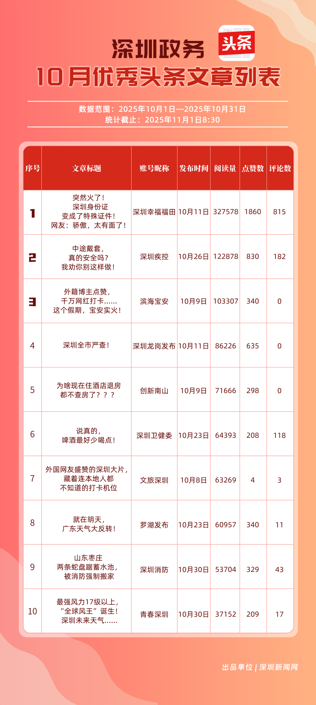 10月,“深圳幸福福田”“深圳疾控”“創(chuàng)新南山”“深圳消防”“羅湖發(fā)布”“青春深圳”“深圳龍崗發(fā)布”“深圳衛(wèi)健委”“深圳龍華”“濱海寶安”共10個政務(wù)頭條號入選“優(yōu)秀政務(wù)頭條號”榜單。“深圳幸福福田”在活躍、互動、傳播均收獲較好成果,蟬聯(lián)榜首;“深圳疾控”得分超90分,持續(xù)發(fā)布民生健康類內(nèi)容,為市民健康保駕護航;“創(chuàng)新南山”內(nèi)容創(chuàng)作緊扣民生與區(qū)域特色,位列榜單第三名?!吧钲谙馈薄傲_湖發(fā)布”等賬號也位列榜單前列,成為區(qū)域政務(wù)新媒體內(nèi)容創(chuàng)新、信息傳遞的標(biāo)桿。