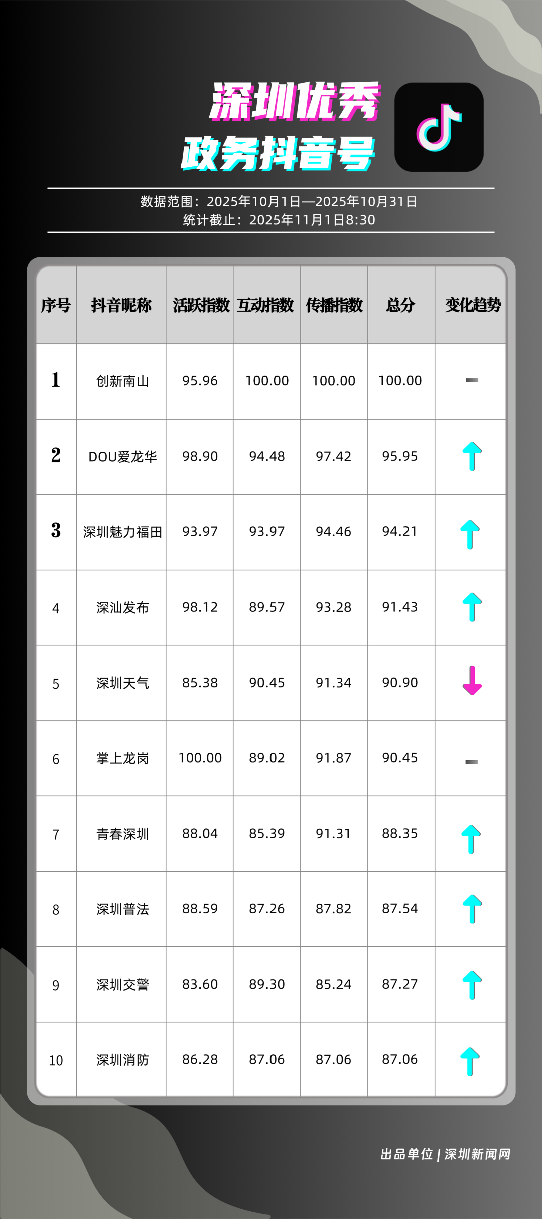 10月,獲得“優(yōu)秀政務(wù)抖音號”稱號的是“創(chuàng)新南山”“DOU愛龍華”“深圳魅力福田”“深汕發(fā)布”“深圳天氣”“掌上龍崗”“青春深圳”“深圳普法”“深圳交警”“深圳消防”。“創(chuàng)新南山”以總分100分居于榜首,展現(xiàn)出其內(nèi)容創(chuàng)作對用戶的強大吸引力與傳播力;“DOU愛龍華”與“深圳魅力福田”分別位列第二、三位,得分在95分左右,排名較上期有所上升?!吧钌前l(fā)布”“深圳天氣”“掌上龍崗”等賬號得分均在90分以上,以年輕化表達展示實用信息,也收獲較好互動、傳播成績。