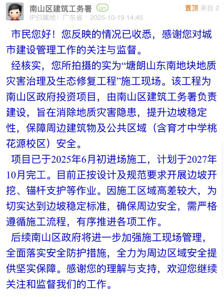 案例點(diǎn)評:針對市民疑慮,相關(guān)部門的回應(yīng)展現(xiàn)出“透明化+精細(xì)化”的治理思路:第一時(shí)間明確工程屬性并同步告知工期安排,主動(dòng)消解市民對工程進(jìn)展的不確定性擔(dān)憂;同時(shí),南山區(qū)建筑工務(wù)署還表示后續(xù)將進(jìn)一步加強(qiáng)現(xiàn)場管理,回應(yīng)關(guān)切。這種回應(yīng)思路既解決了市民的困惑,也通過可感知的舉措傳遞了對安全的重視態(tài)度,是城市工程類訴求處置中“信息公開”“風(fēng)險(xiǎn)閉環(huán)”的有效示范。