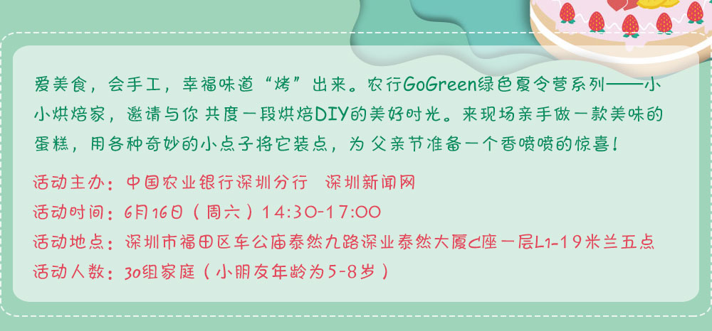 6月16日下午,中國農(nóng)業(yè)銀行深圳市分行聯(lián)合深圳新聞網(wǎng)開展了一場以親子體驗為主題的Go Green綠色夏令營之“小小烘焙家”活動,讓孩子們通過DIY蛋糕培養(yǎng)動手能力和創(chuàng)造能力,為爸爸送上一份特別的父親節(jié)禮物。[詳細]