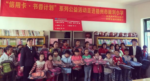 2016年,由深圳農(nóng)商行發(fā)起的“信用卡公益計(jì)劃·書(shū)香圖書(shū)室”捐贈(zèng)活動(dòng),深入走進(jìn)廣西壯族自治區(qū)的偏遠(yuǎn)山區(qū),為當(dāng)?shù)剌^為貧困的學(xué)校學(xué)生送去溫暖。此次活動(dòng)為當(dāng)?shù)氐闹写逍W(xué)、合林小學(xué)及龍降小學(xué)捐贈(zèng)各類(lèi)圖書(shū)共計(jì)2217本、文具6665套、書(shū)包153個(gè)、書(shū)桌書(shū)柜椅子共115個(gè)、體育用品108套,有效地幫助這三所小學(xué)建設(shè)完整的圖書(shū)室,為學(xué)生們創(chuàng)造良好的閱讀環(huán)境。[詳細(xì)]